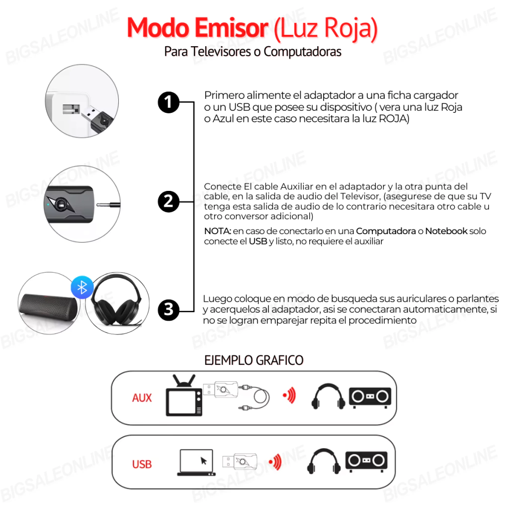 ¡¡¡ TENEMOS STOCK DE ESTE ARTICULO !!!ADAPTADOR BLUETOOTH 4 EN 1 EMISOR Y RECEPTOR* Conecta tus Auriculares o parlantes bluetooth a tu TV Smart o PC para que salga el sonido.* O úsalo también para convertir esos equipos de sonidos y estéreos sin bluetooth en parlantes con bluetooth para que los conectes a tu celular y escuchar tu música preferidaAdáptalos a diferentes equipos multimedia sin tecnología Bluetooth.¿ COMO SE CONECTA ?Solo necesita ser alimentado con un puerto USB y luego conectar el cable Mini Plug 3.5mm (ya incluido) al TV o donde desees conectar y este pasara o transmitirá el audio.En el caso de computadoras solo conectalo en un puerto USB de tu PC y acerca tus auriculares o parlantes bluetooth para que estos se entrelacen entre si automáticamente.¿ USA BATERIA ?No usa batería, ya que el puerto USB es para que se alimente el dispositivo y asi poder usarlo (puedes conectarlo también a una ficha cargador de celulares)MODO DE EMISOR (LUZ ROJA)- Conecta el EMISORBT4 a tu TV Smart con el USB y cable mini plug a una entrada Auxiliar miniplug 3.5mm (la comun de auriculares) o RCA de tu TV (el blanco y rojo).- En el caso de usarlo en una Computadora solo conecta el USB y listo.- Luego acerca tus auriculares Bluetooth o parlantes Bluetooth y estos se emparejaran (dejara de titilar).- Ya podrás disfrutar de todo el sonido que salga del tv en tus Auriculares o Parlantes.EN MODO DE RECEPTOR (LUZ AZUL)- Es el modo mas común de bluetooth; el cual para conectar necesitas conectar el EMISORBT6 a un puerto USB (o bien sea en una ficha de carga de celular) y el cable miniplug en una entrada Auxiliar o de plug RCA del dispositivo.- Luego enciende tu bluetooth desde tu celular o Tablet y reproduce la música que quieras- ES IMPORTANTE QUE EL EQUIPO MULTIMEDIA DONDE DESEAS CONECTAR ESTE DISPOSITIVO TENGA UNA ENTRADA BIEN SEA AUXILIAR O DE AUDIO RCA (EL BLANCO Y ROJO)-PARA USAR EN COMPUTADORA SOLO ES PARA AUDIO "PARLANTE Y AURICULAR" UNICAMENTE.NOTA: ESTE EMISOR BLUETOOTH NO ES COMPATIBLE CON MARCAS DE ALTAS GAMAS. JBL, APPLE, MOTOROLLA, SONYDATOS TECNICOS:- Distancia de funcionamiento hasta 10 metros según interferencias del ambiente- Versión bluetooth: V5.0- Instalación simple: solo enchufe, enlace y listo- Compatible con parlantes portátiles, parlantes de Home Theater, estéreos de auto, TV Smart- Frecuencia: 2.4GHzEstamos para atender todas tus dudas!