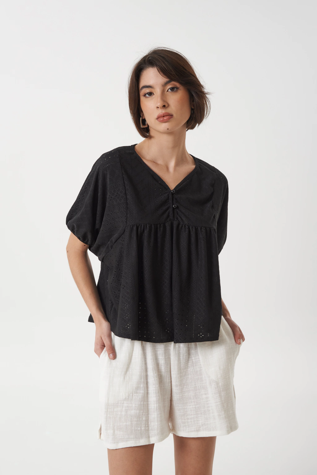BLUSA DE BRODERIE CON LYCRA ESCOTE V CON DOS BOTONES Y RECORTE CON PINZAS Y MANGAS AMPLIAS CON ELÁSTICO