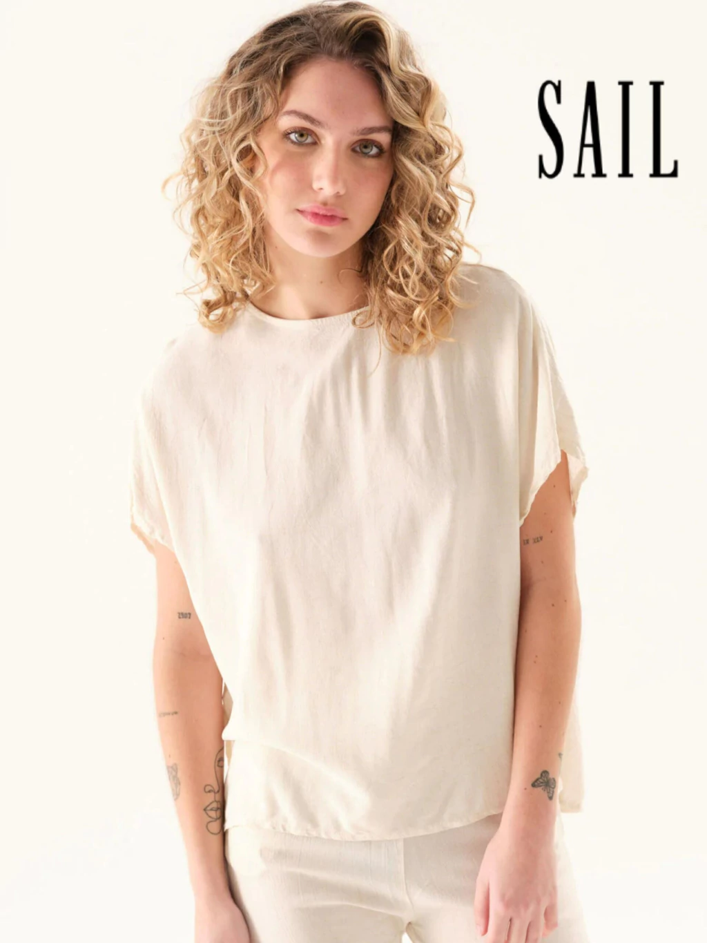 SAILBlusa de manga corta con un diseño fresco y moderno, que presenta tajos laterales en el ruedo para un toque dinámico y cómodo. La espalda está adornada con elástico y frunces, creando una silueta femenina y ajustada que se adapta al cuerpo con delicadeza.Confeccionada en una mezcla de 85% rayón y 15% lino, esta blusa ofrece una textura suave y ligera, ideal para climas cálidos.Perfecta para un look casual o semi-formal, su estilo versátil se puede combinar fácilmente con pantalones o faldas para un toque chic y cómodo.Referencia: La modelo mide 1,65m y está usando talle S.