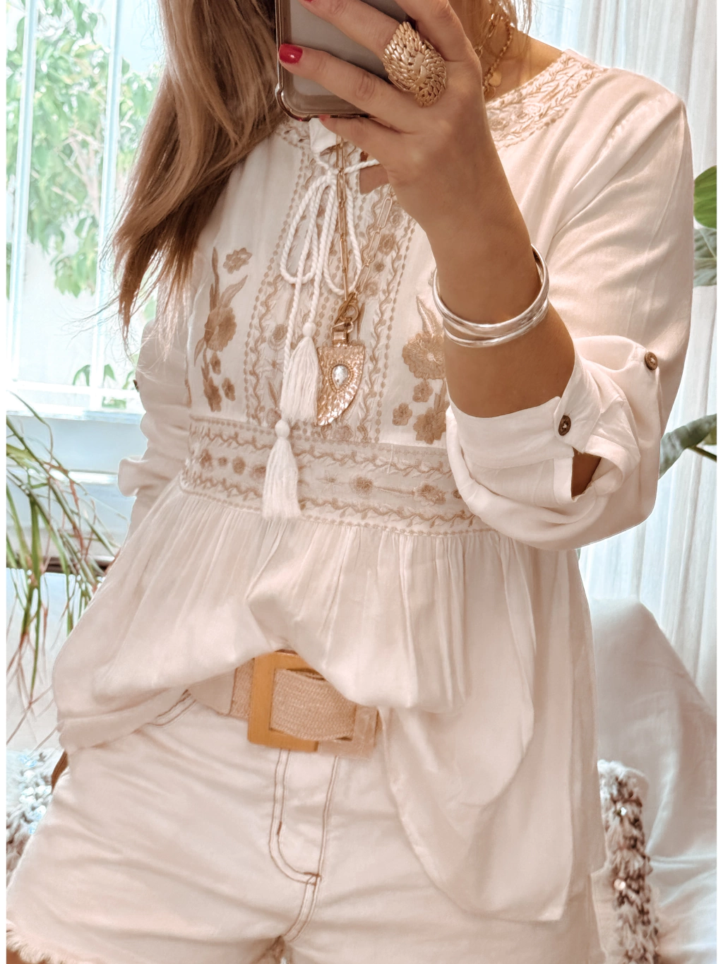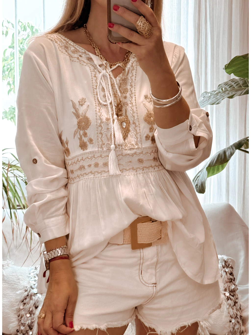Blusa tipo camisola de poplin con bordado en doradoMEDIDAS APROXIMADAS:TALLE 1 (Equivalente a un S):Sisa: 49cmLargo: 63cmTALLE 2 (Equivalente a un M):Sisa: 52cmLargo: 63cmIMPORTANTE!!Las medidas pueden variar levemente entre un corte y otro.Te recomendamos lavar a mano con agua fría, no centrifugar y secar a la sombra.
