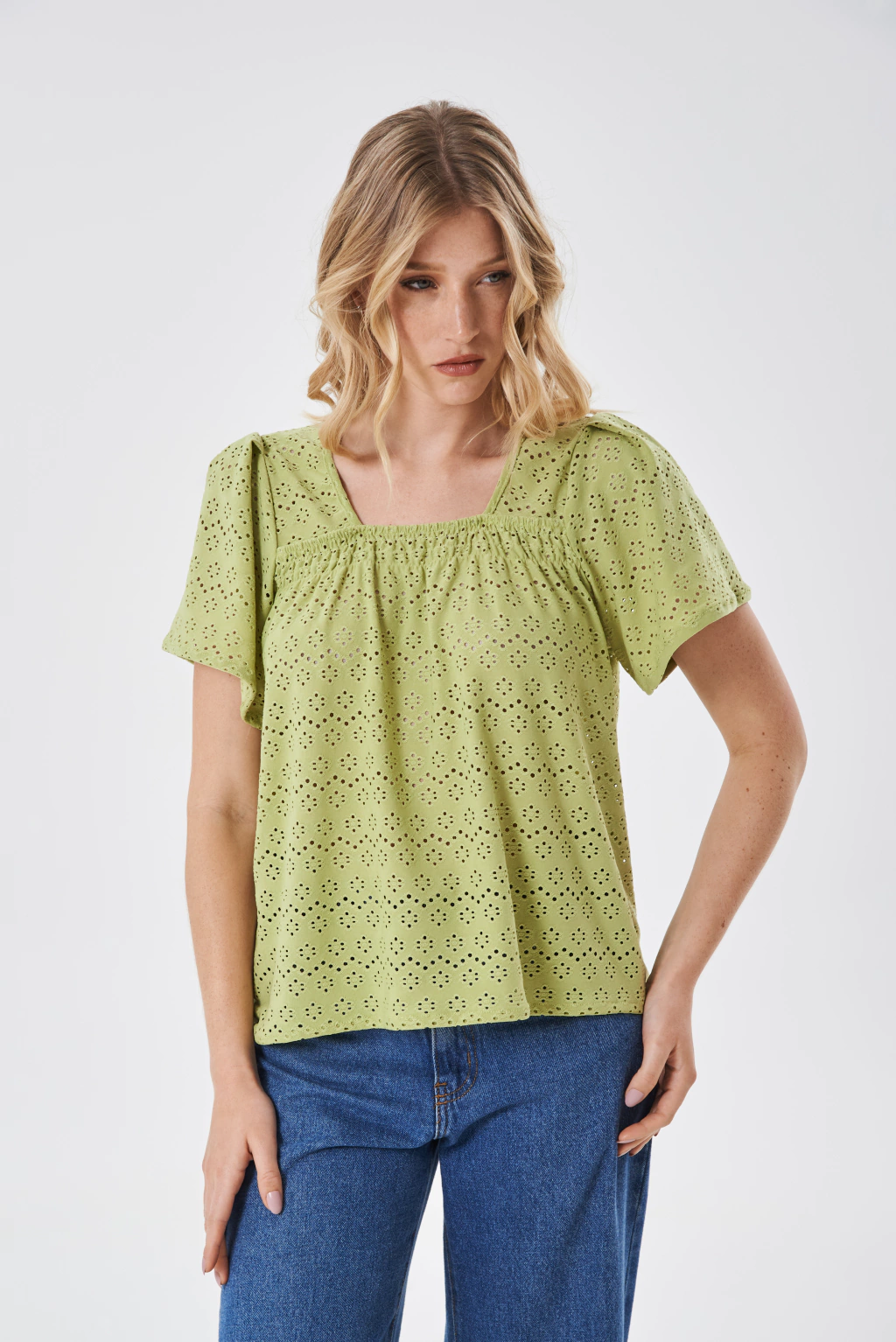 BLUSA DE BRODERIE CON LYCRA ESCOTE RECTO CON ELÁSTICO Y TABLEADO EN LAS MANGAS