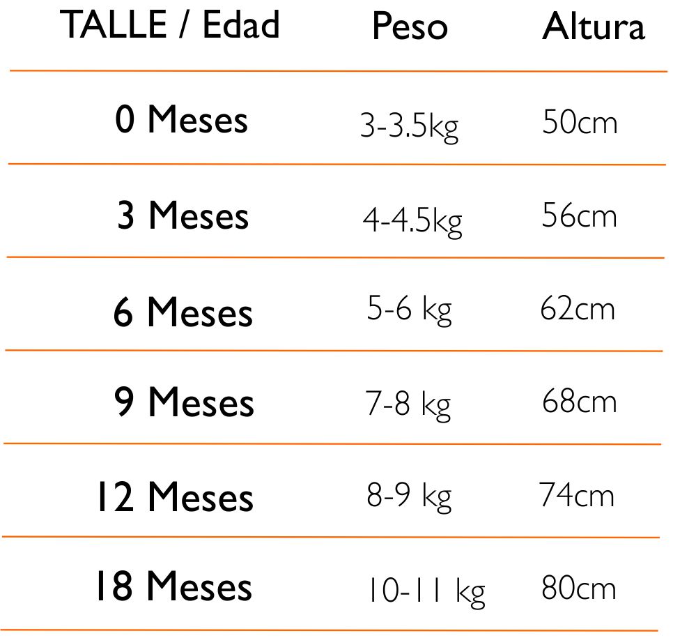 Creamos la siguiente tabla con la relación entre edad, peso y altura (aproximada) para que te guíes por si no tenes información precisa del bebé. ¡Tené en cuenta que algunos bebés son más grandes o más pequeños a igual edad!