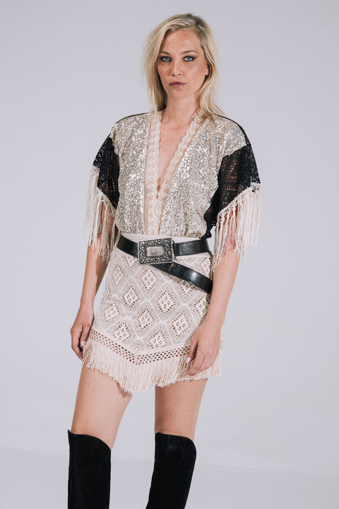 Body cruzado de encaje negro en delantero y espalda. La bombacha es de lycra color negra. Le sumamos lentejuelas en el busto y puntilla beige. Y le agregamos flecos en las mangas para dale más onda! Podes completar el look con la falda anémona beige.Es talle único, pero al ser holgado y elastizar abarca varios talles!Les dejamos las medidas: Largo hasta cintura 48cm / Largo hasta bombacha 75 cm / Busto 86 hasta 120 cm / Cintura 90 hasta 120 cm /Cadera hasta 115 cm.