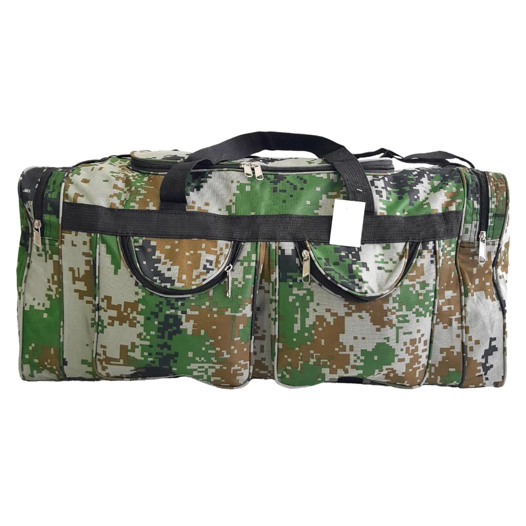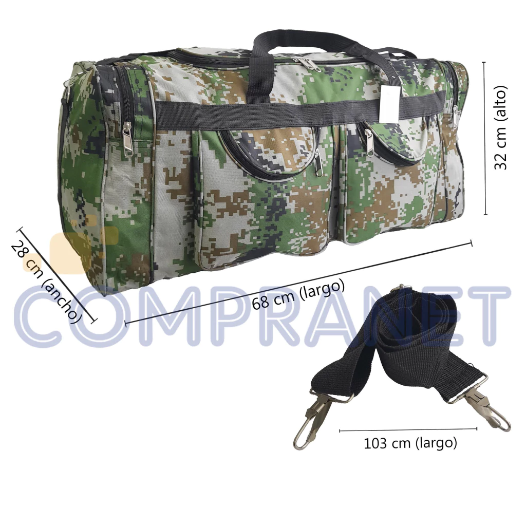 Bolso de Viaje Grande Económico y estampado. Ideal para los viajes de vacaciones, posee un compartimento central de gran capacidad para guardar todo lo que necesites.Con 2 bolsillos en el frente del bolso ambos con cierre y deslizador metálico. Posee, además, dos bolsillos laterales de ambos lados, con cierre y deslizador metálico. El bolso se abre por arriba, donde tiene doble cierre con deslizador metálico.No posee bolsillos internos, ni está forrado en el interior.Incluye correa ajustable para llevarlo como bolso colgado al hombro, o manijas a los costados para llevarlo en la mano.Modelo 1: CamufladoModelo 2 Camuflado pixelado VerdeModelo 3 Camuflado pixelado Gris.Material: PoliésterMedidas: 68 cm (largo) x 32 cm (alto) x 28 cm (prof.)Largo máximo de la tira para colgar: 103 cm (largo)