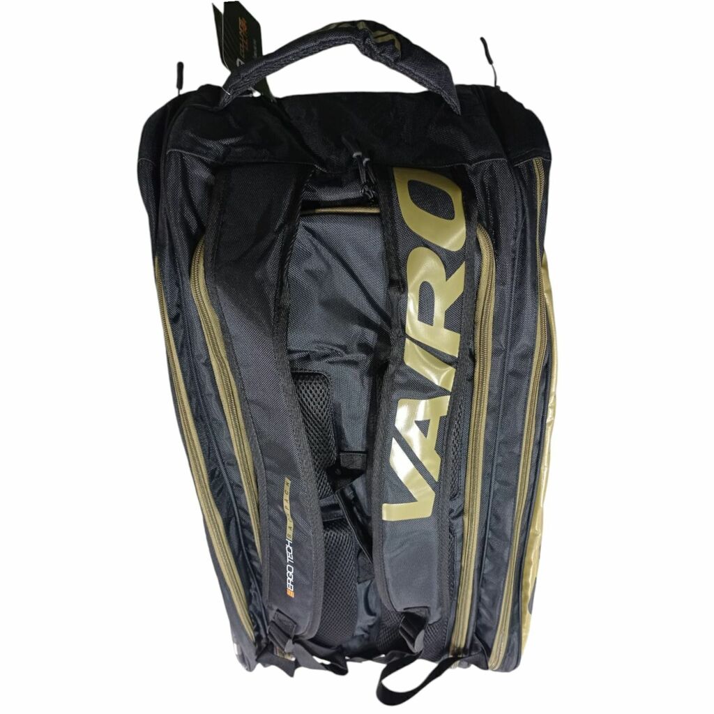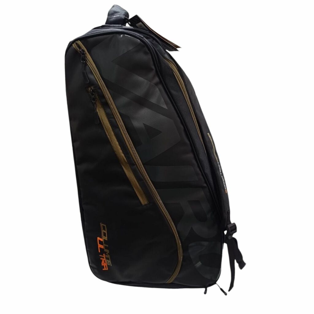 BOLSO MOCHILA PALETERO VAIRO COLUMNS ULTRAEste paletero es amplio y práctico, con múltiples compartimentos que te permiten llevar tus palas de pádel, zapatillas y otros accesorios como ropa de pádel, pelotas u overgrips. La organización es clave, manteniendo las palas separadas de otros elementos para evitar posibles daños.Cada compartimento se accede fácilmente mediante cierres individuales, con espacios laterales frontales y laterales que aprovechan al máximo cada rincón. Esto facilita la organización y acceso a tus pertenencias.El paletero cuenta con asas que permiten llevarlo cómodamente como mochila. Su diseño en color negro con detalles en dorado oscuro le confiere un estilo elegante. Está confeccionado principalmente con poliéster, garantizando durabilidad y resistencia.* Compartimiento para zapatillas* Bolsillos exteriores* Compartimientos para paletasEspecificaciones tecnicas:Medidas: Medidas: 70 x 30 x 34 Cm