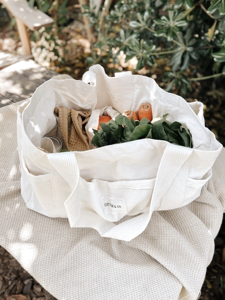 Bolso para compras de lona con bolsillos y divisiones. Medida: LargeEste bolso fue diseñado para que hagas tus compras sin necesidad de usar bolsas plásticas.Al tener bolsillos de distintos tamaños, ayuda a que organices mejor la mercadería. Podés usarlo solo o en conjunto con las bolsas para alimentos de lienzo también disponibles en nuestra tienda online.También podés usarlo para llevar a la playa o al parque con tu mate, para el gym, como bolso para el bebé, o para organizar tus lanas, pinturas, maquillajes, o lo que quireras!Exterior: Lona 13 Oz. 100% algodón crudo (sin proceso de teñido o blanqueo).Interior: Lienzo 20/20 100% algodón crudo (sin proceso de teñido o blanqueo).Manijas: Cinta mochilera 100% algodón crudo (sin proceso de teñido o blanqueo).Etiqueta: 100% algodón crudo - Estampa tinta libre de ftalatos.Medidas: 46 cms ancho x 33 cms alto x 15 cms profundidad. Medida manijas: 52 cmsEste producto es reutilizable, reciclable, biodegradable (3 a 5 meses) y compostable.Lavar a mano con agua fría - Secar a la sombra - No retorcer - No usar blanqueadores - Planchaa temperatura alta 200°Una vez cumplida su vida útil, este producto se puede devolver a la tierra bajo la forma de compost.Para ello recomendamos cortarlo en trozos con la ayuda de una tijera para acelerar el procesode degradación (entre 3 y 5 meses).