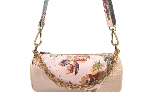 • Bolso/ bandolera cilíndrica.• Combinada en materiales sintéticos de diferentes texturas.• Cierre plástico multicolor.• Detalle de cadena plástica en el frente.• Posee bolsillo interno.• Correa sublimada regulable y desmontable.• Largo correa: mínimo 0,75 m - máximo 1,40 m.• Medidas: 25 cm de largo x 11 cm de diámetro.