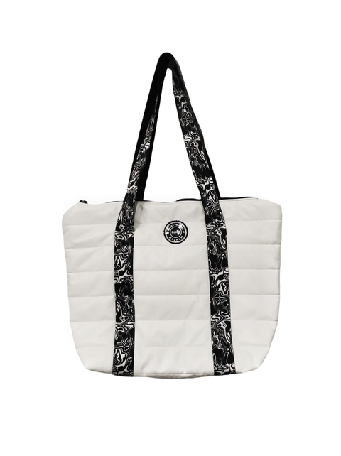El TOTEBAG POP CLAIRE es de tela matelasse impermeable, forrado en silver impermeable, con guantera interna, con cierre en parte superior. Cintas de piliester sublimadasMedidas; 46cm de alto x 36cm de ancho x 12cm de fuelle