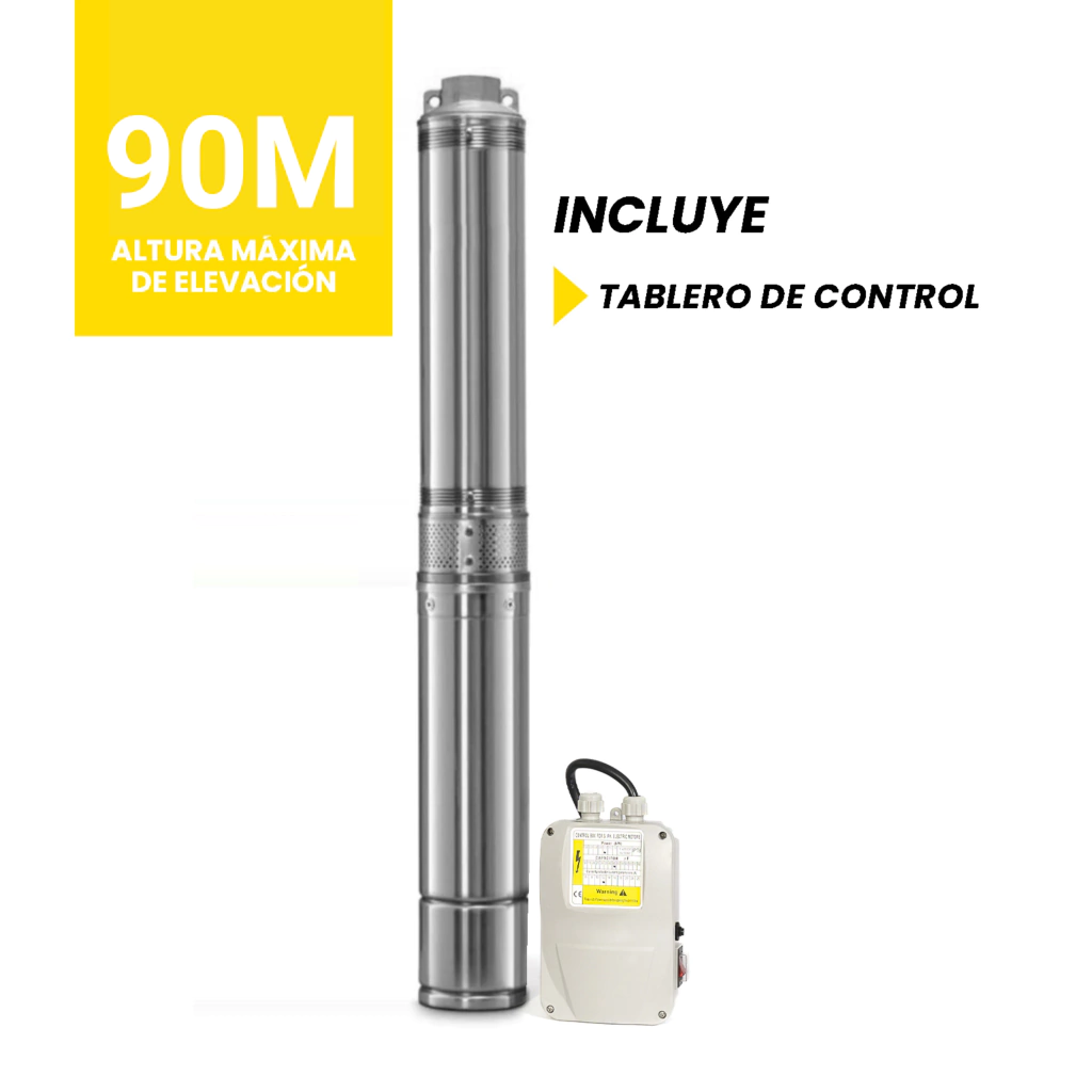 BOMBA DE AGUA SUMERGIBLE BRANX + Tablero de controlAlimentacion: 220V - 50HzCorriente: 8.8APotencia: 1.1kW - 1.5HPTemperatura maxima: 35°CProteccion: IP68Caudal maximo: 6500L/Hr.Boca de descarga: 1 1/2"Altura manometrica maxima: 90m.Motor bobinado en cobreProtector termico incorporadoRango de PH del agua: 6 a 8Incluye sistema anti arenaMonofásicaProfundidad máxima: 90mDiseñada para uso en agua limpia.INCLUYE:Bomba de aguaTablero de controlManual de usuario