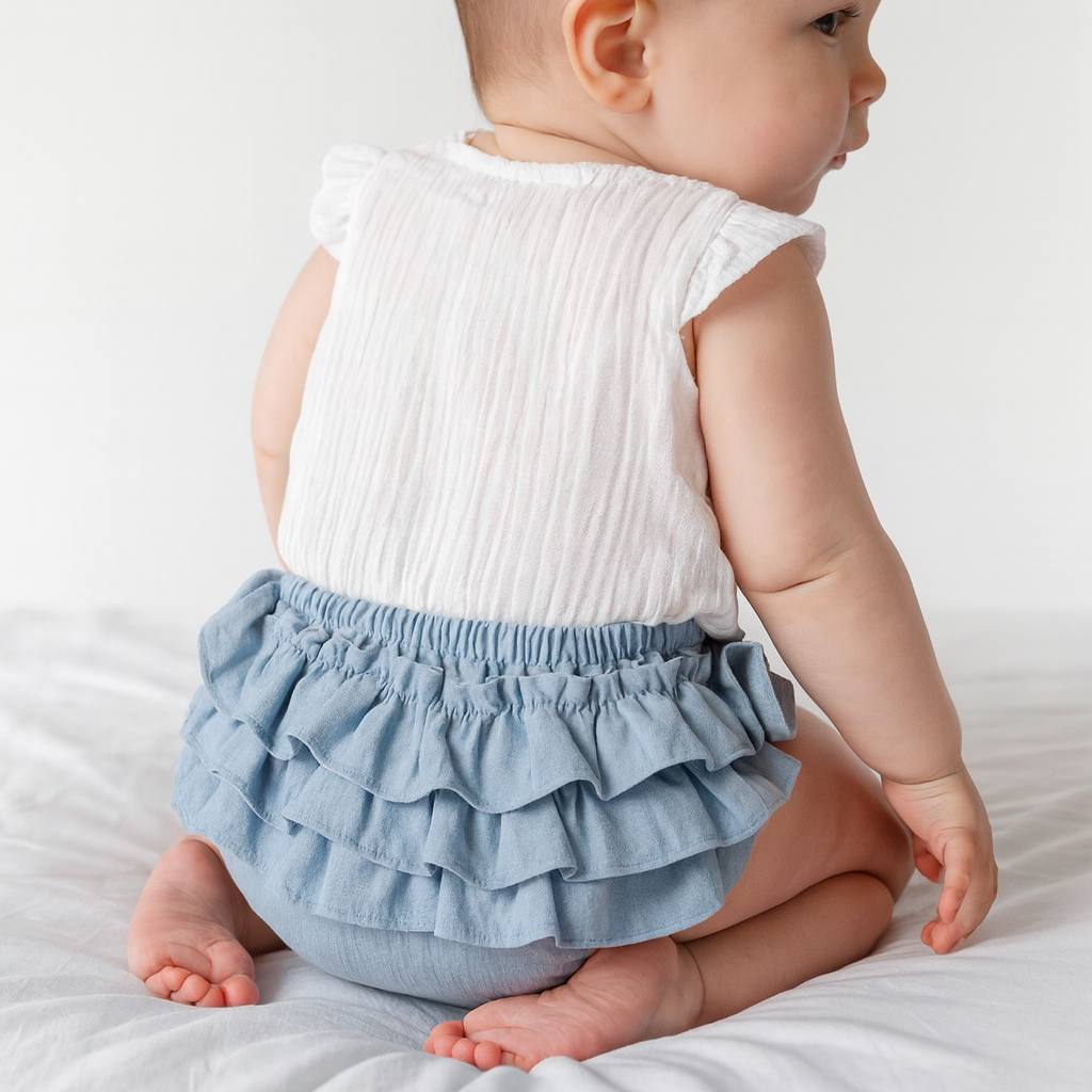 ✨Cada pieza está hecha a mano, con volados fruncidos artesanalmente que aportan un toque adorable y original. El elástico está completamente forrado en tela para no rozar ni marcar la piel, adaptándose suavemente al cuerpo del bebé.