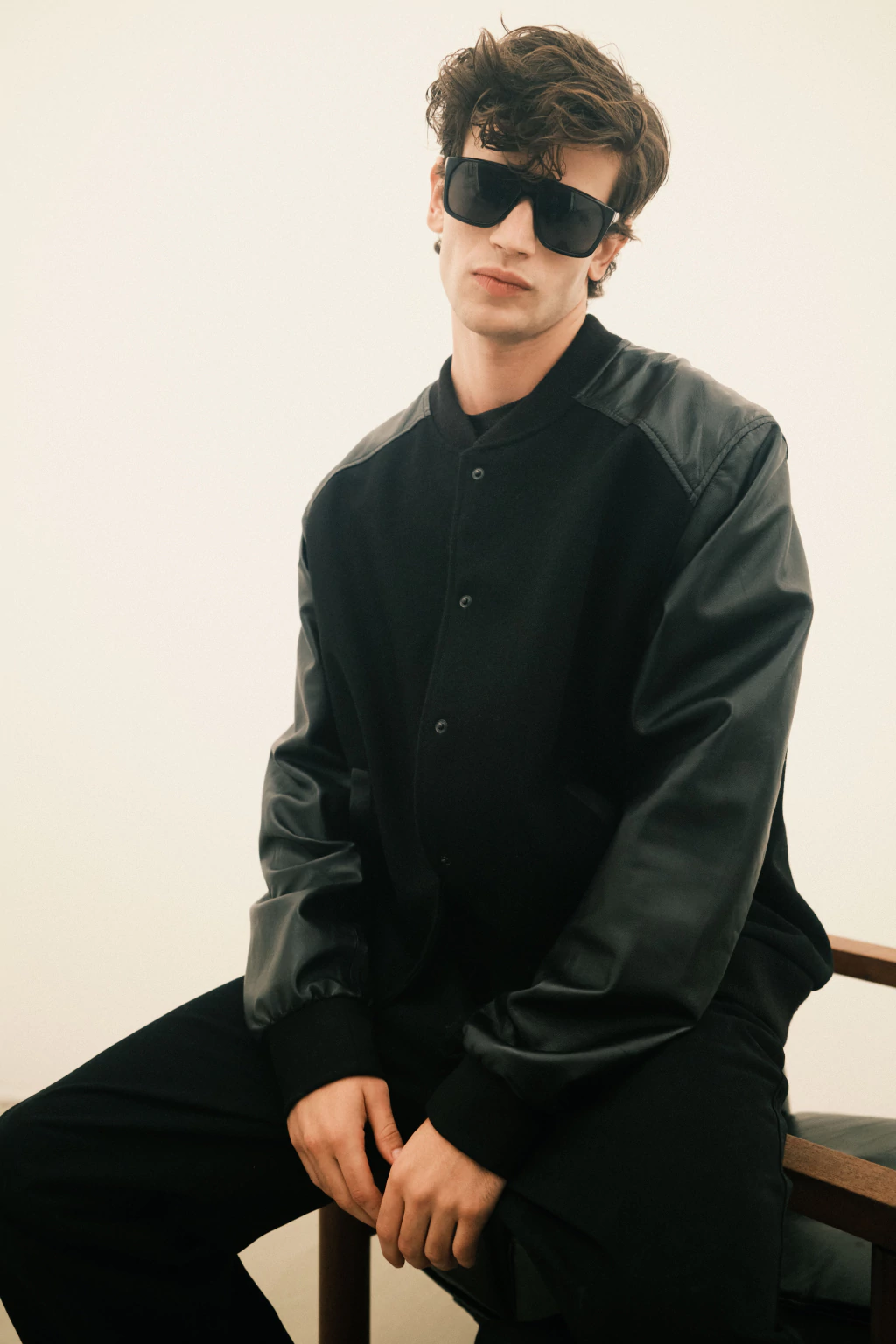 | Bomber de paño de lana con detalle de cuero en mangas. Forrada internamente. Composición: 100% CUERO OVINO- 100% LANA - FORRERIA-100% POLIESTER |