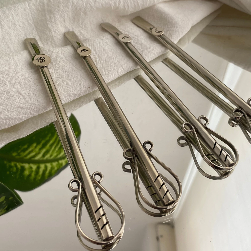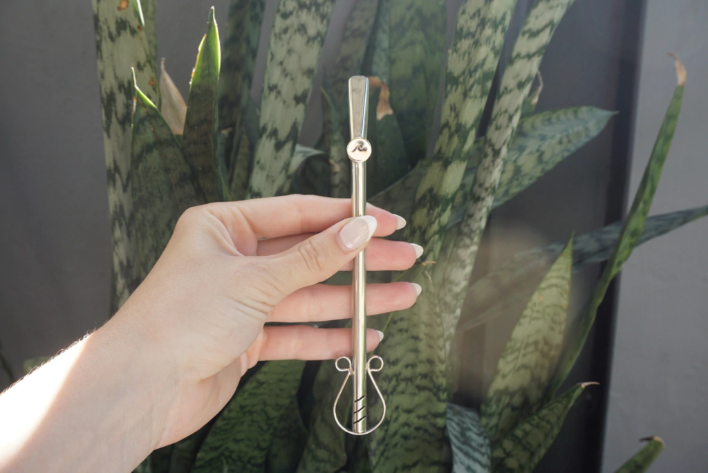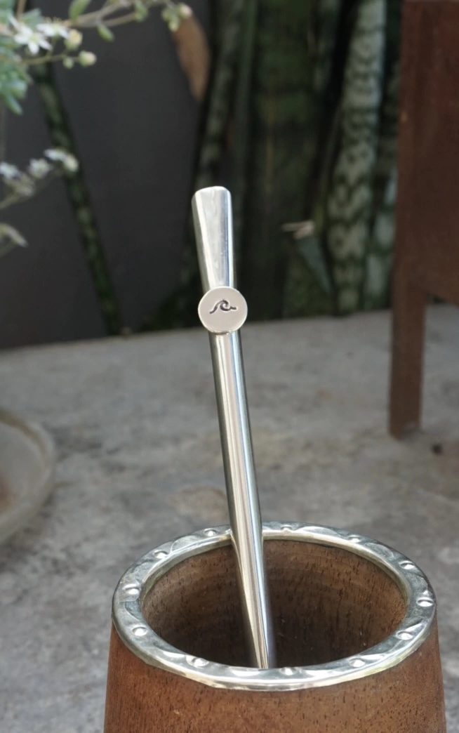 Descripción: Bombilla hecha 100% a mano. El regalo perfecto para la gente super matera. Tiene su extremo diseñado para facilitar mover la yerba y limpiar el mate. (NO INCLUYE MATE)Material: alpaca.Modelo: bombilla con simbolo de OlaPersonalizado: no se puede personalizar.