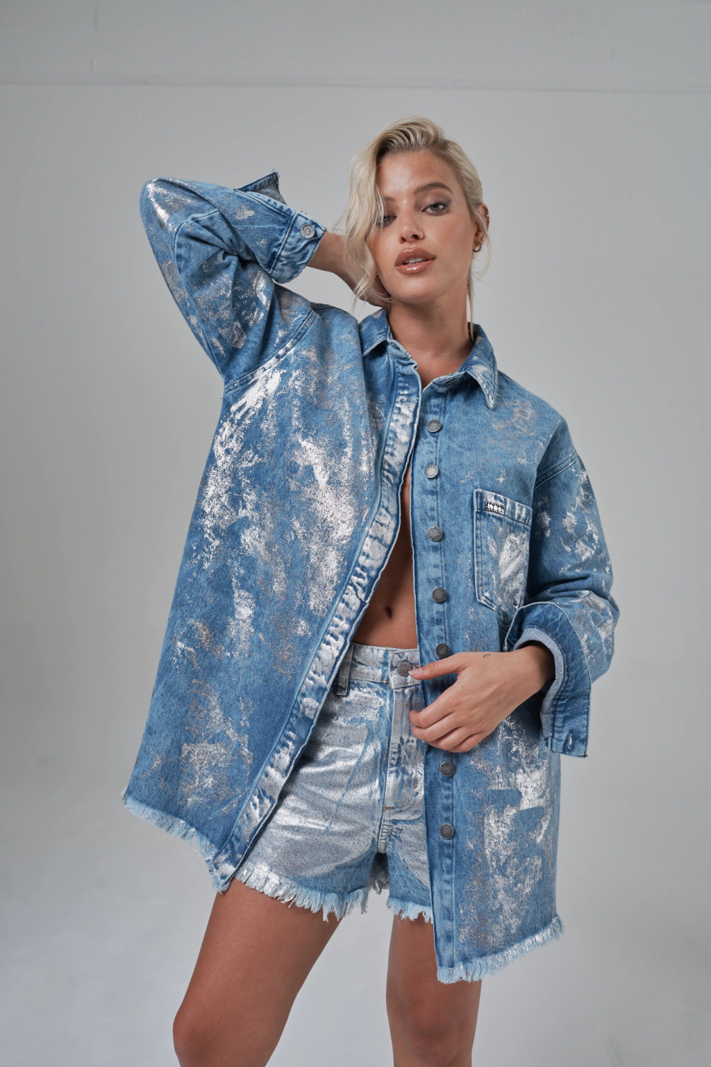 Camisaco de denim con proceso artesanal de foil color PLATA. Lleva botones personalizados invisibles en el frente y un bolsillo del lado izquierdo. Corte al ruedo desflecado. Prenda atemoral para usar en cualquier momento del año.