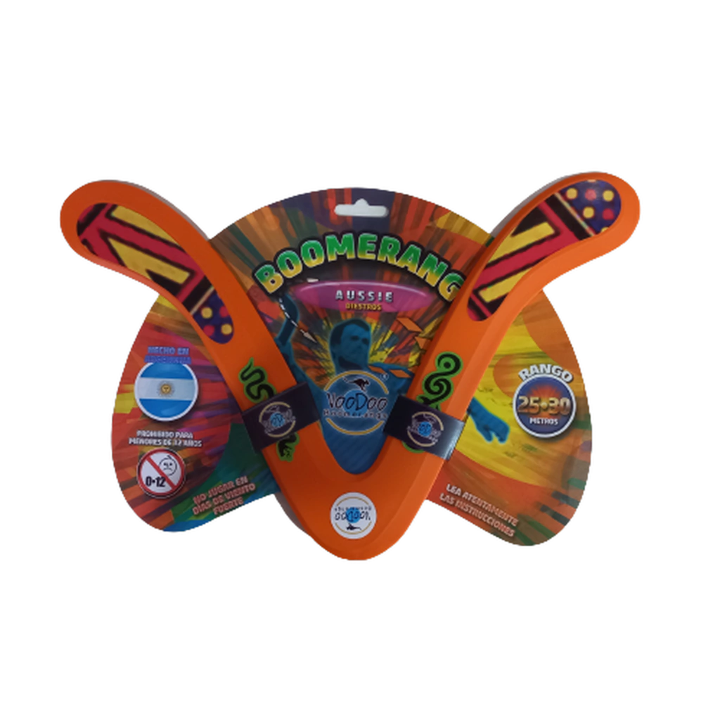 El Boomerang Aussie está diseñado para lanzadores diestros y es adecuado para niños y adultos. Requiere mayor rotación y potencia de lanzamiento que un boomerang tradicional y es un boomerang muy seguro para lanzar, estable al viento y de fácil atrapada.