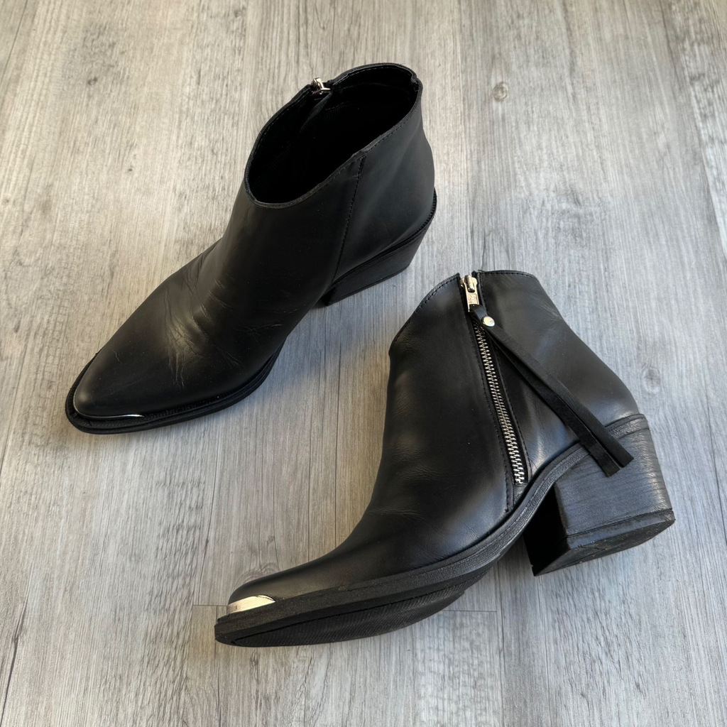 BOTA TEXANA CORTA EN CUERO VACUNO CON CIERRE LATERAL Y PUNTERA METALICAAltura taco 6cmAltura caña 12cmAltura suela 1cmTaco anti deslizanteHorma normalPARA MÁS INFORMACIÓN DE TALLES HAZ CLIC enhttps://www.lasroxy.com/tabla-de-talles/