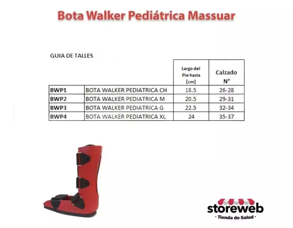 Bota Walker Pediátrica Ortopédica Massuar - Inmovilizador de Pie y TobilloLaBota Walker Pediátrica Ortopédica Massuares un dispositivo ortopédico diseñado para la inmovilización y contención de la articulación del tobillo y el pie. Es ideal para el tratamiento de lesiones del miembro inferior, como fracturas, esguinces, tendinitis y otras lesiones de tejidos blandos. También es recomendada para proteger el pie y el tobillo en la recuperación postoperatoria.Precauciones y recomendaciones:El pie debe quedar completamente contenido dentro de la bota, sin sobresalir ningún dedo.El borde superior de la bota debe quedar al menos a 2 cm por debajo de la cabeza del peroné.Verificar el estado de la suela antes de usar. Si está desgastada, reemplazarla para evitar resbalones.Revisar periódicamente los velcros para asegurar un ajuste adecuado.No utilizar sobre piel lesionada o herida.Lavar la funda con agua fría y jabón neutro. Secar a la sombra y no exponer al sol o altas temperaturas.Guía de talles: Consulta la guía de talles para seleccionar la medida correcta.El producto se vende por unidad.