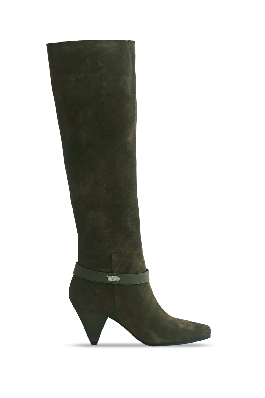 Botas de gamuza natural con horma en punta. Detalle de tira desmontable con remache de marca TVG.Altura de taco:7 cm (parte más alta)Altura de caña:48 cm