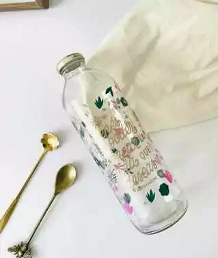 Botella de vidrio con tapa a rosca de metal, impresa en serigrafía.?? ¡Ideal para agua, jugo o leche!? Capacidad: 1 lt. Medidas: 25 cm. x 7 cm de diam.