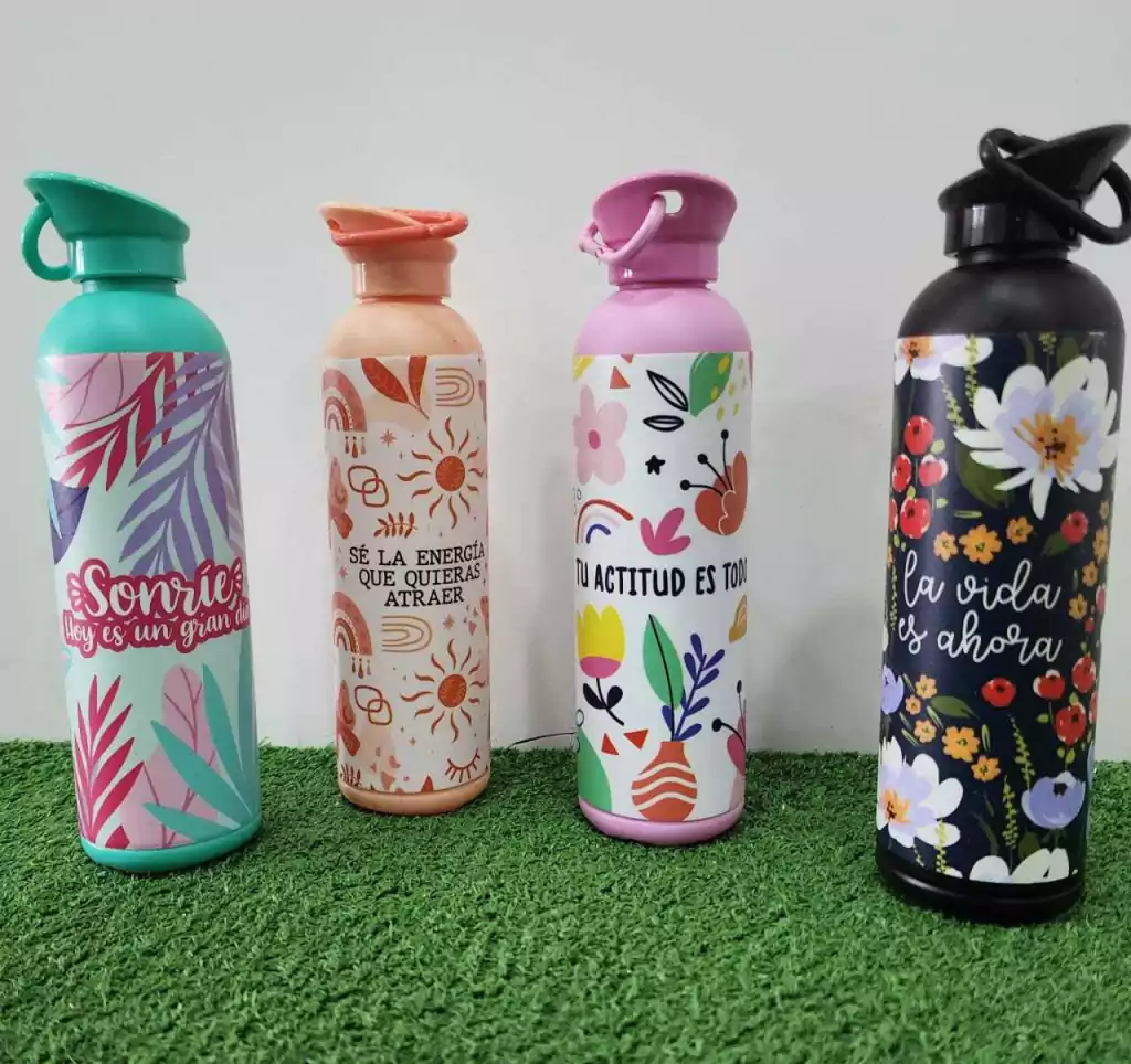 • Botella recta de plástico en colores pastel con palabra WATER estampada en serigrafía blanca.