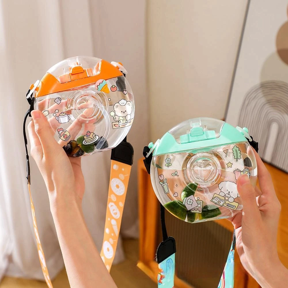 Botellita en forma de donas super tiernos con stickers y dijes con diseño bonitos para pegar en donde desees.Cuenta con una correa ajustable, sorbete con pico rebatible.Medidas(cm):380ml Diámetro: 14cm