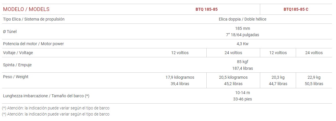 Se puede instalar tanto en proa como en popa y tiene un motor eléctrico de corriente continua con hélices dobles. Disponible en 12 V o 24 V y tres opciones de potencia de motor diferentes, todas las cuales requieren un diámetro de túnel de 185 mm (7,3 pulgadas).