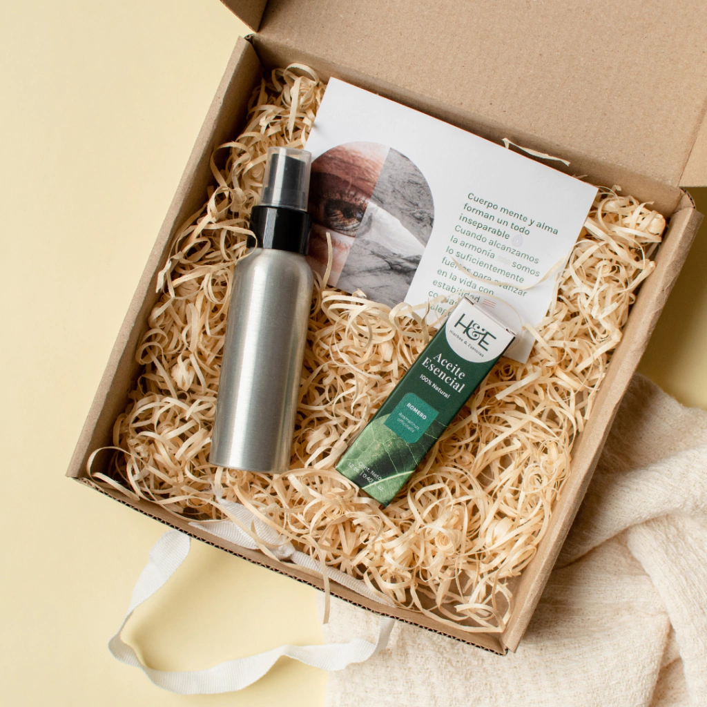 -Aceite esencial de romero + envase de aluminio para preparar una bruma tónica.