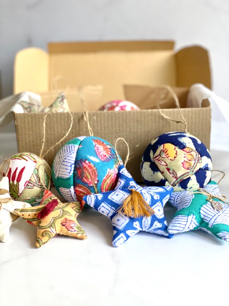 Una linda propuesta para decorar el arbolito o tu casa con telas estampadas por Block Print... te va a encantar!!!!Que tiene esta caja:3 Esferas grandes n°6 (una con corazón, una lisa y una combinada)3 Esferas medianas n°4 (todas las esferas combinadas)5 Estrellas grandes(miden aproximadamente 5x5 cm)4 Estrellas medianas(miden aproximadamente 3,5x3,5 cm)*Las estrellas tienen distitos detalles como borlas de hilo, mini cascabeles, moños, dijes! Las cajas ya están armadas por lo que los colores de los adornos no se pueden elegir...pero están pensadas para que combinen de manera armónica entre sí todos los adornos.A tener en cueta: los tiempos de envío puede sufrir alguna demora!! (cada pieza de la caja se confecciona a mano cuidadosamente!)