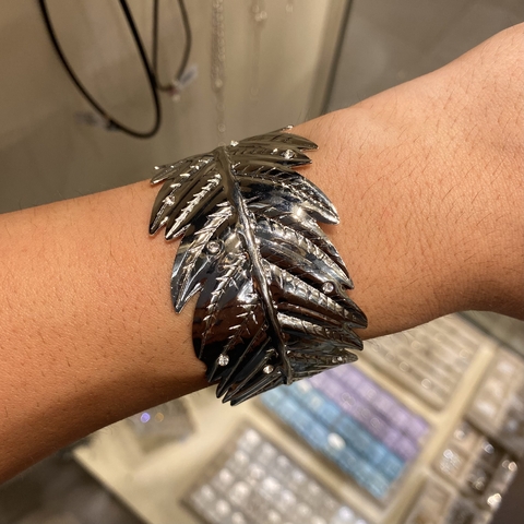 Brazalete paraMUÑECAabierto, en forma deHOJAconSTRASS.Color:PLATEADO.Material:FANTASIA.- CONSULTAR STOCK DISPONIBLE -