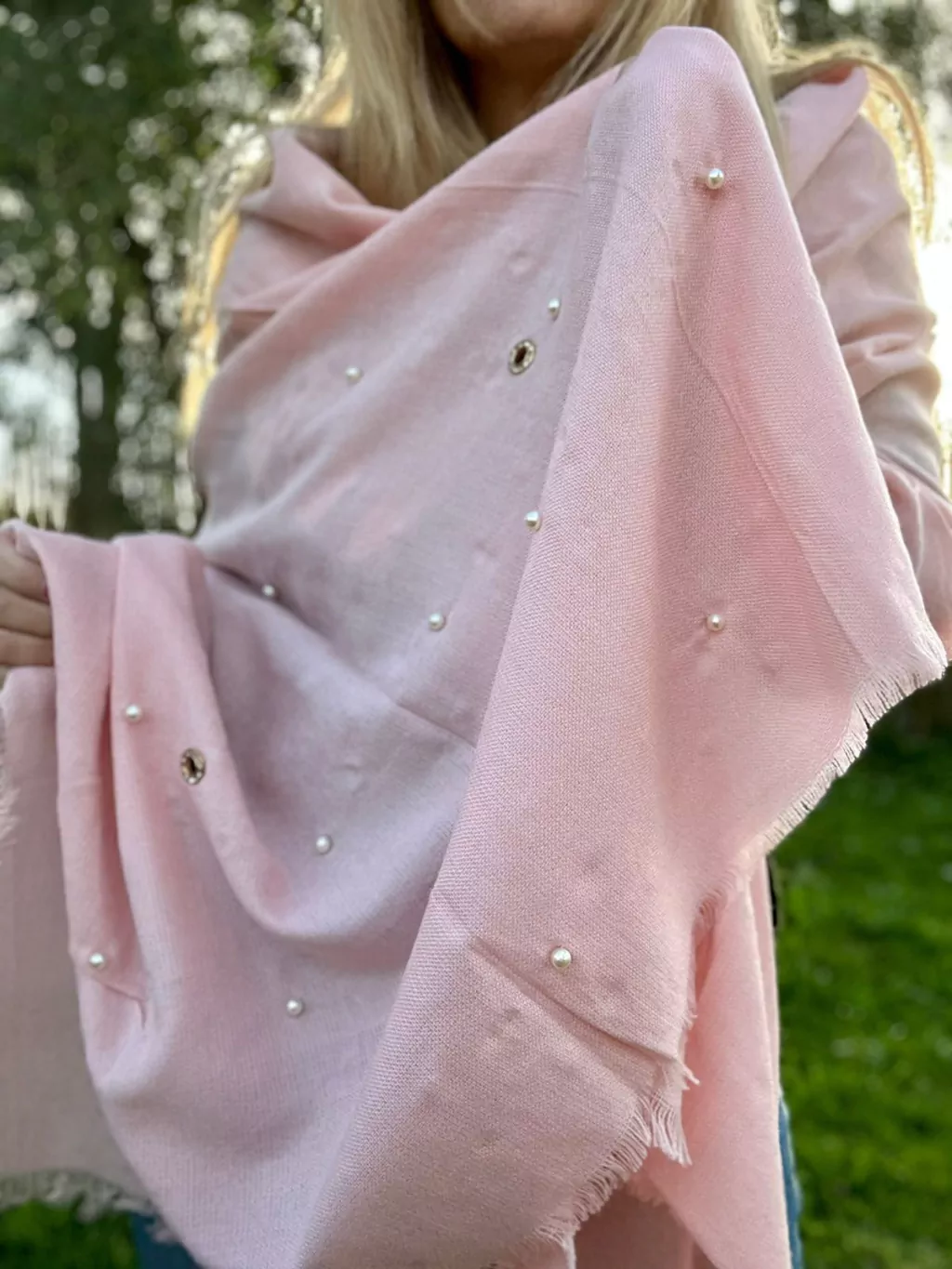 Bufandon de lanilla de 2 m de largo por 0, 75 cm de ancho con perlitas y circulos en metal dorado con mini strasses