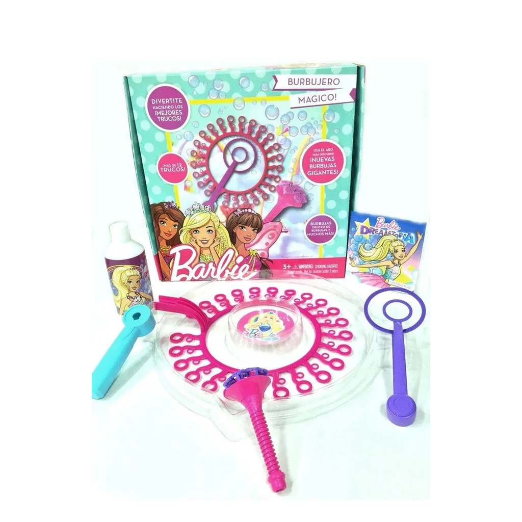 BURBUJERO MÁGICO DE BARBIEHacer las burbujas con agua jabonosa ha sido siempre motivo de gran diversión, tanto para niños como para adultos, alrededor de todo el mundo! Con este burbujero de Barbie podrás hacer maravillosas burbujas en segundos!!Divertite creando súper burbujas!! Usa el aro para descubrir nuevas burbujas.gigantes. Crea burbujas dentro de burbujas, más de 12 trucos y mucho más!!INCLUYE:1 Burbutrompeta para soplar y hacer burbujas.1 Aro doble para crear múltiples burbujas.1 Recipiente plástico.1 Frasco de líquido concentrado.- Recomendado a partir de los 3 años.- Para mejores resultados utilizar en exteriores.