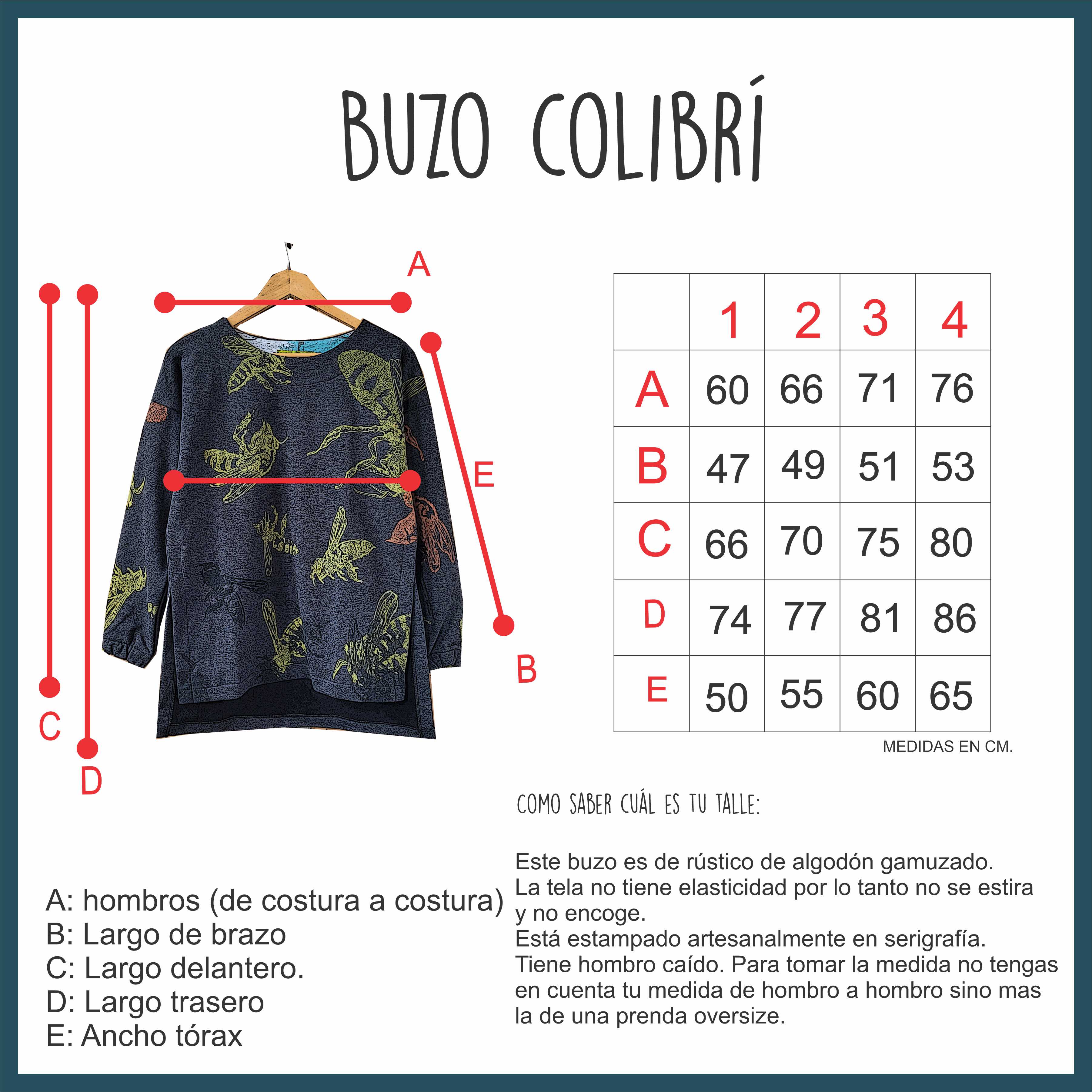 Buzo de rústico de algodón gamuzado estampado artesanalmente en serigrafía. Cada uno es único ya que estampamos tela por metro y luego confeccionamos la prenda, por lo tanto la disposición de la estampa varía de prenda en prenda. Los puños tienen elástico y tiene dos tajos en cada lateral.