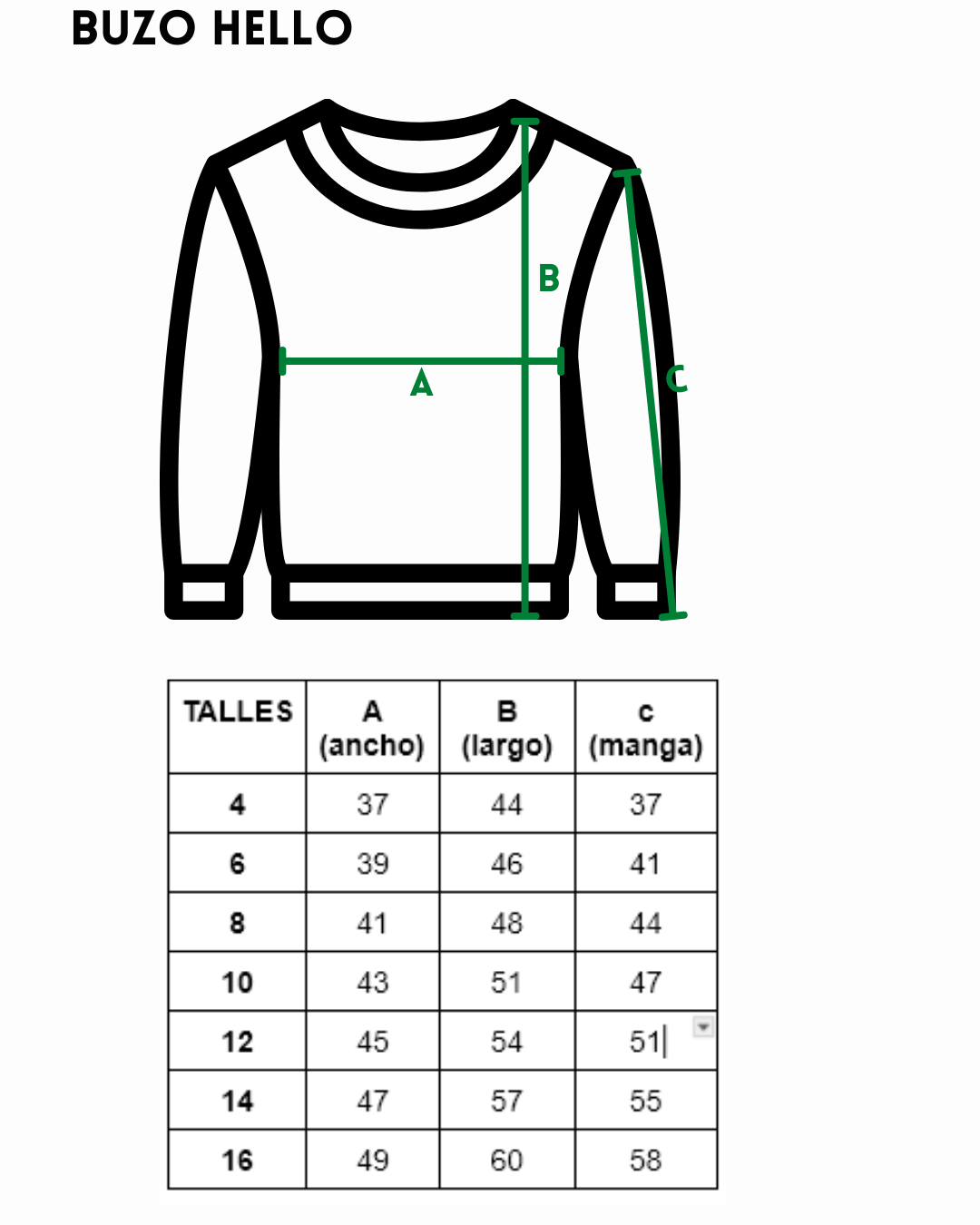 Viene del talle 4 al 16, sus medidas las dejamos abajo y tambien en una foto adjunta, las medidas son especificas para cada artículo, esto quiere decir que por cada prenda nos tomamos el tiempo para medir cada talle y cada artículo nuevo. Te recomendamos siempre comparar con una prenda que le vaya bien, para no tener inconvenientes con los talles.
