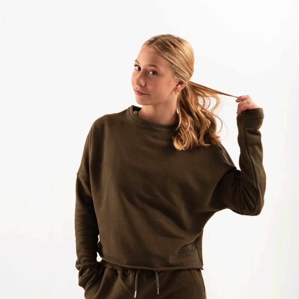 Buzo cuello redondo con puños y ruedos al corte rústico de verano con estampa en el frente,