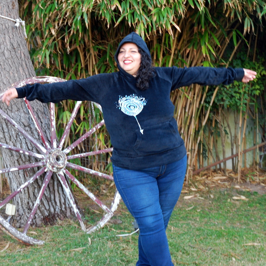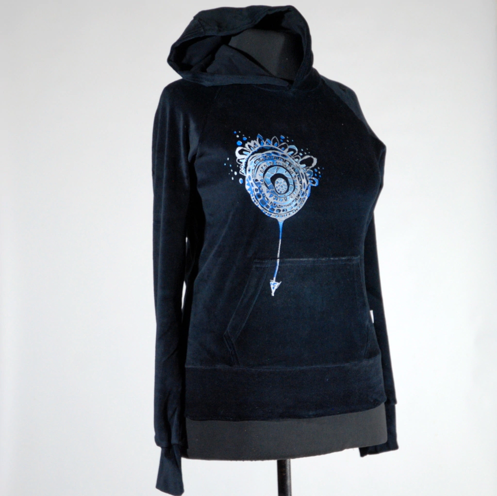 Buzo de Plush con capucha y bolsillo delantero tipo canguro. Pintado a mano y en los casos de batik también están teñidos a mano.