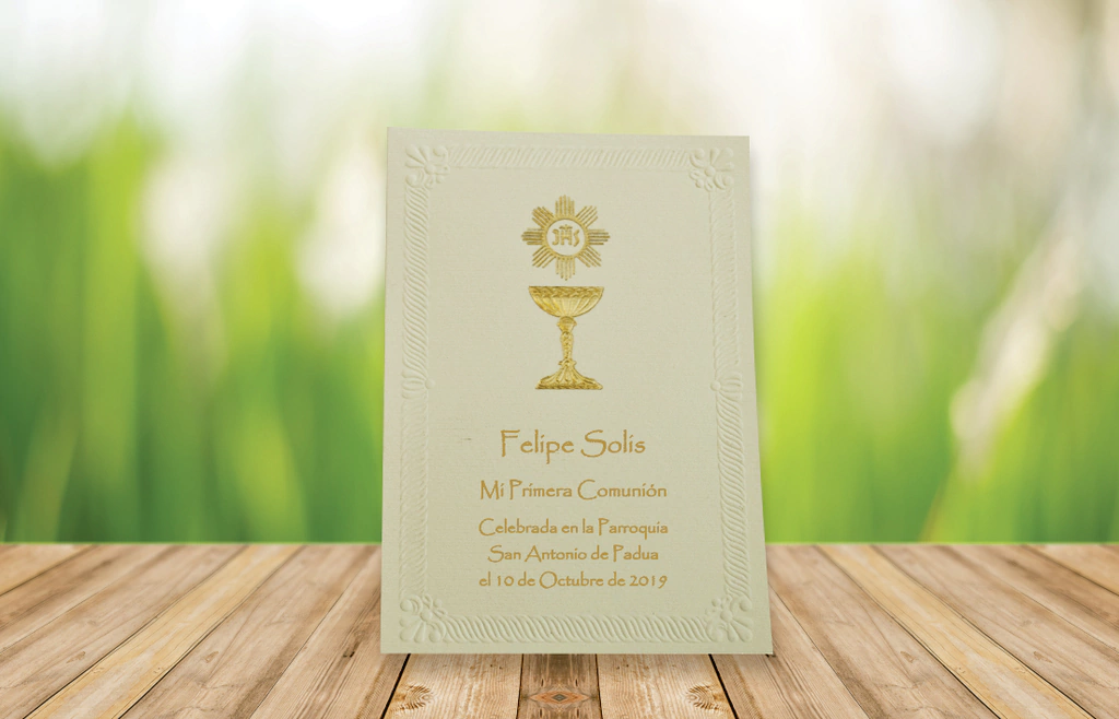Estampas de Comunión Modelo C 1260Pack x 25 unidadesFormato: 9 x 13 cmPapel Especial Tramado 250gStamping Oro MetalizadoDetalles en Relieve*El precio incluye personalización de texto.