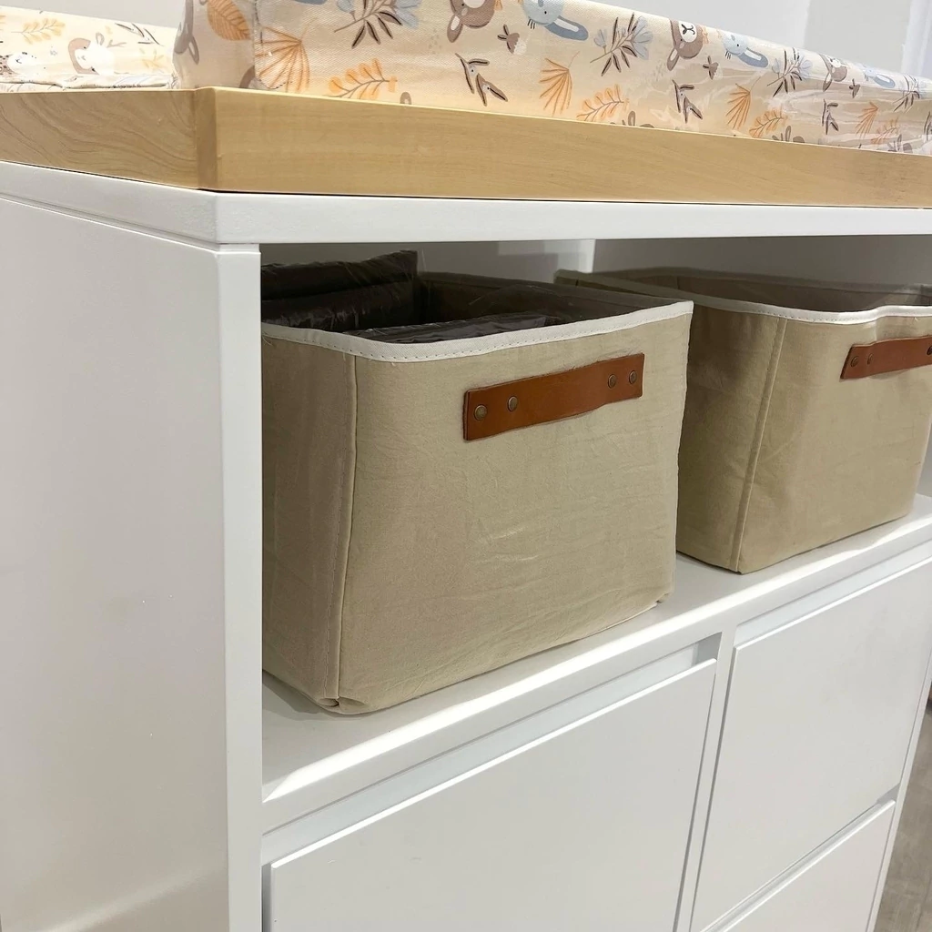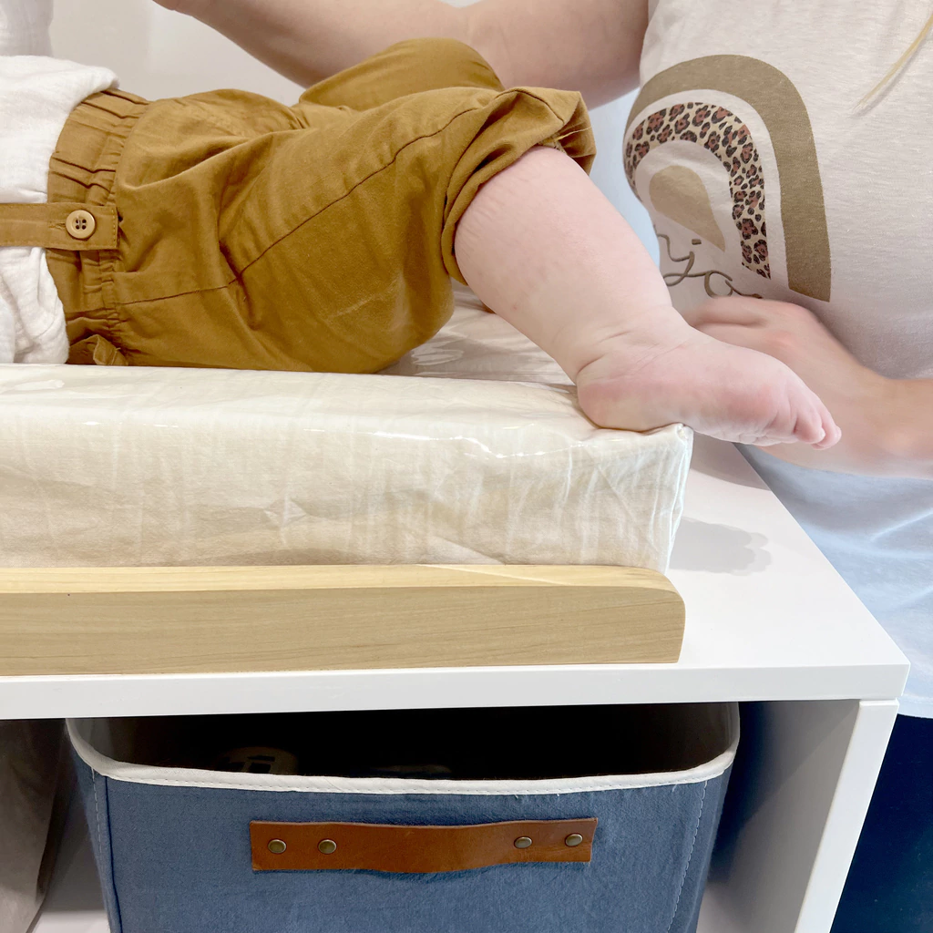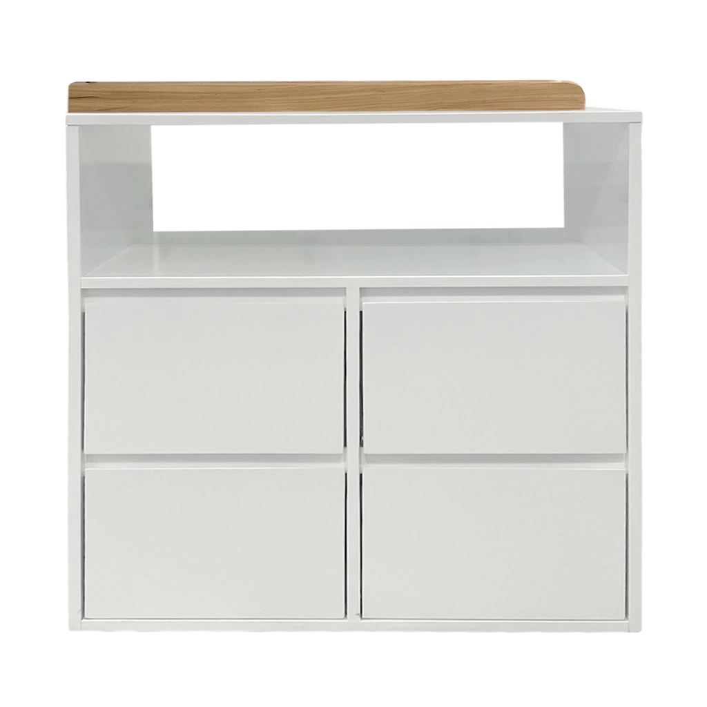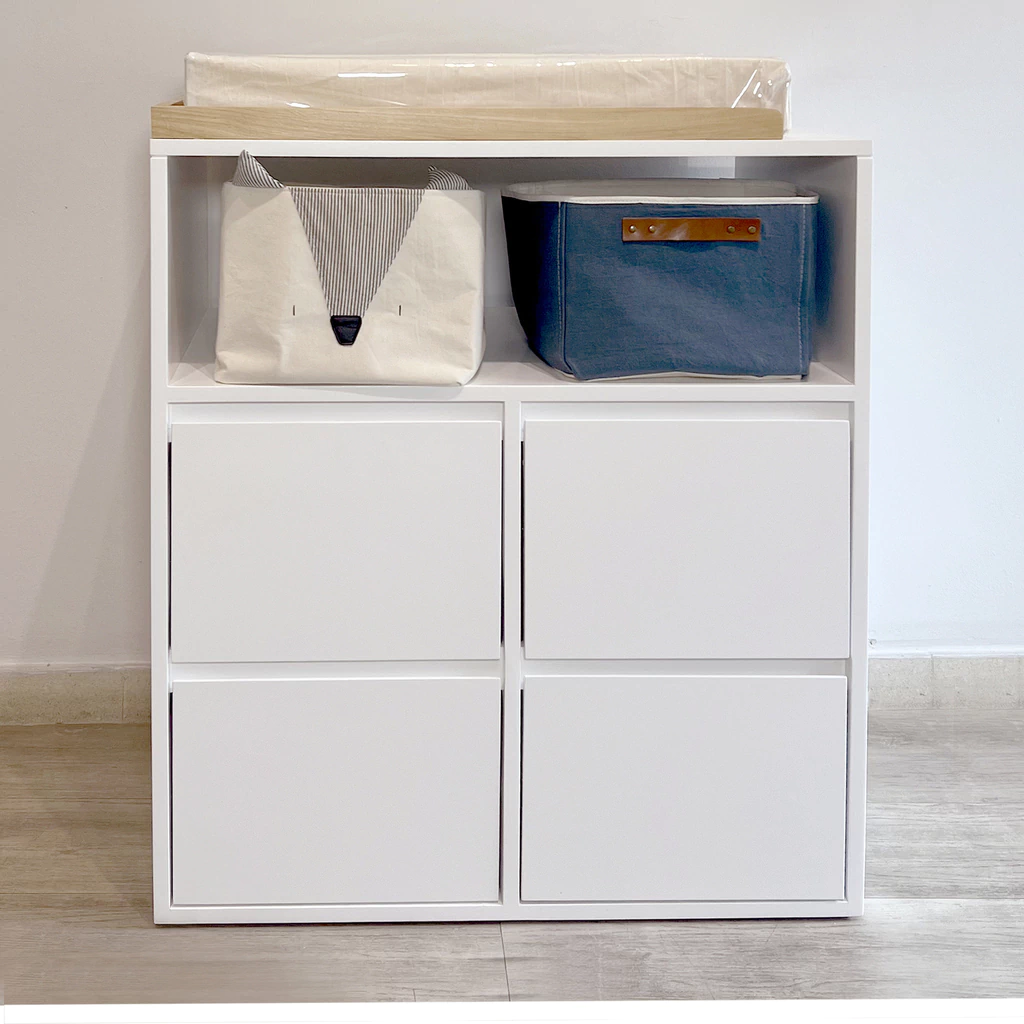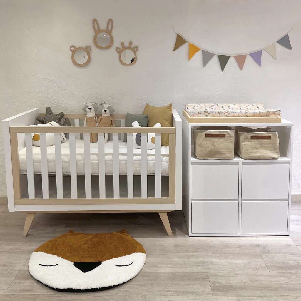 La cómoda cambiador Akira, fabricada en Mdf de doble placa laqueada atóxica combinada en Guatambú, es una solución práctica para el cuarto del bebé. Diseñada con topes antivuelcos redondeados, garantiza una estabilidad óptima. Cuenta con cuatro cajones de 35 cm de profundidad, equipados con correderas telescópicas que permiten la apertura total