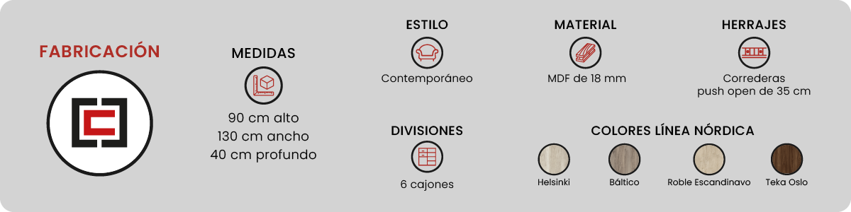 Nuestra Cómoda Felicia es un producto de fabricación propia, realizada con MDF de 18mm, posee un estante superior combinado con otro color a elección en su interior. Dispone de 6 cajones reforzados con correderas push open de 35 cm. Garantía de 1 año ante posibles deficiencias de producción.