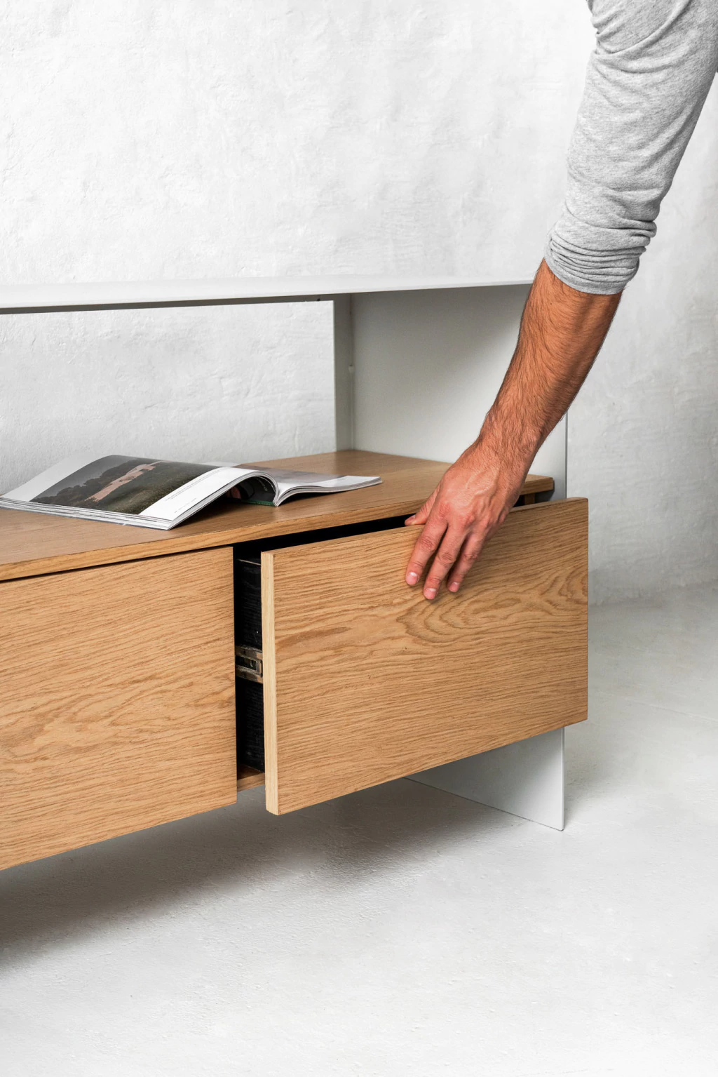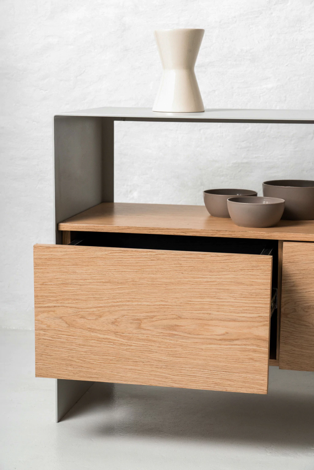 Cómoda baja hecha en chapa plegada, 3 cajónes de madera con sistema push o telescópico.