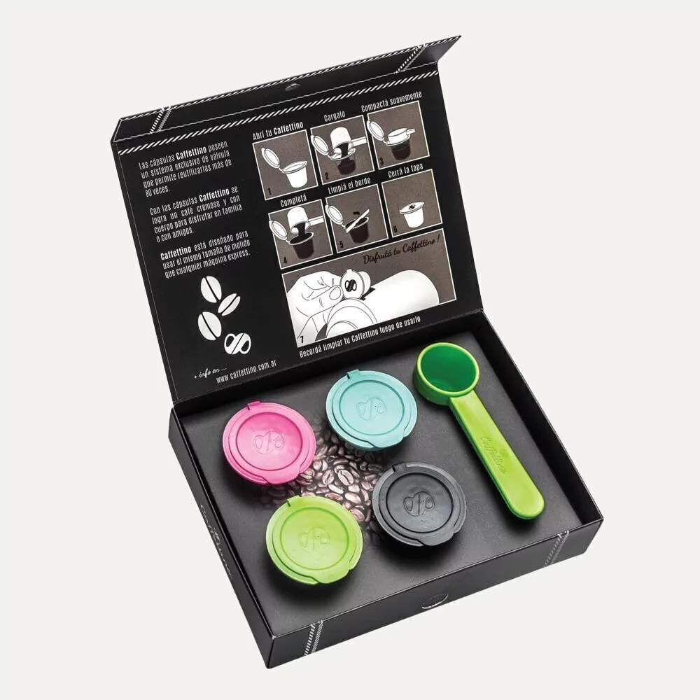 Contine 4 cápsulas en vívidos colores para personalizar las cápsulas a gusto y una cuchara con la medida justa para cargar adecuadamente la cápsula.