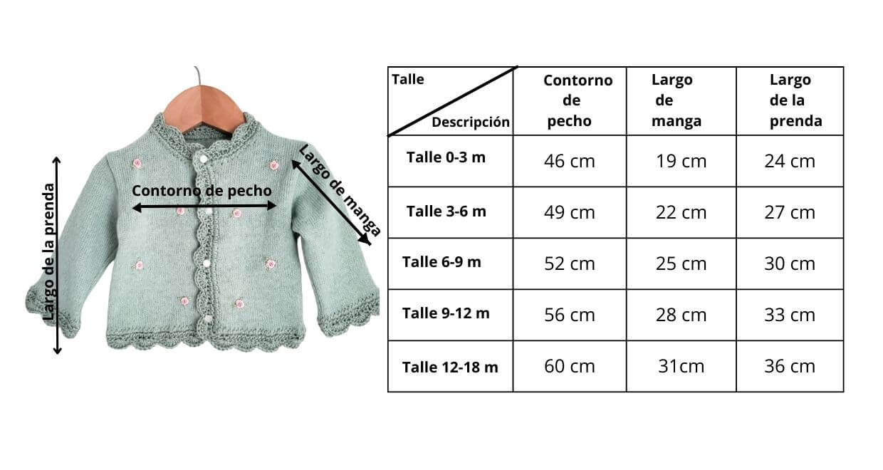 Tejido en lana acrilica hipoalergénica con terminaciones en crochet en punto abanico en el ruedo y las mangas lo que hace que sea una prenda única imposible de replicar industrialmente. Esta bordada a mano con pequeñas flores rococó no hay dos prendas iguales porque cada flor bordada es una pequeña obra de arte hecha con tiempo, dedicación y amor. Al verlo puesto en un bebé transmite cuidado, delicadeza y el amor que solo lo hecho a mano puede dar. Es muy suave al tacto ideal para cuidar la delicada piel de tú bebé.