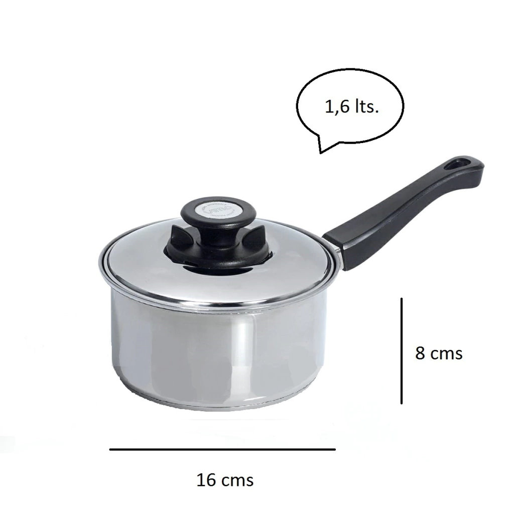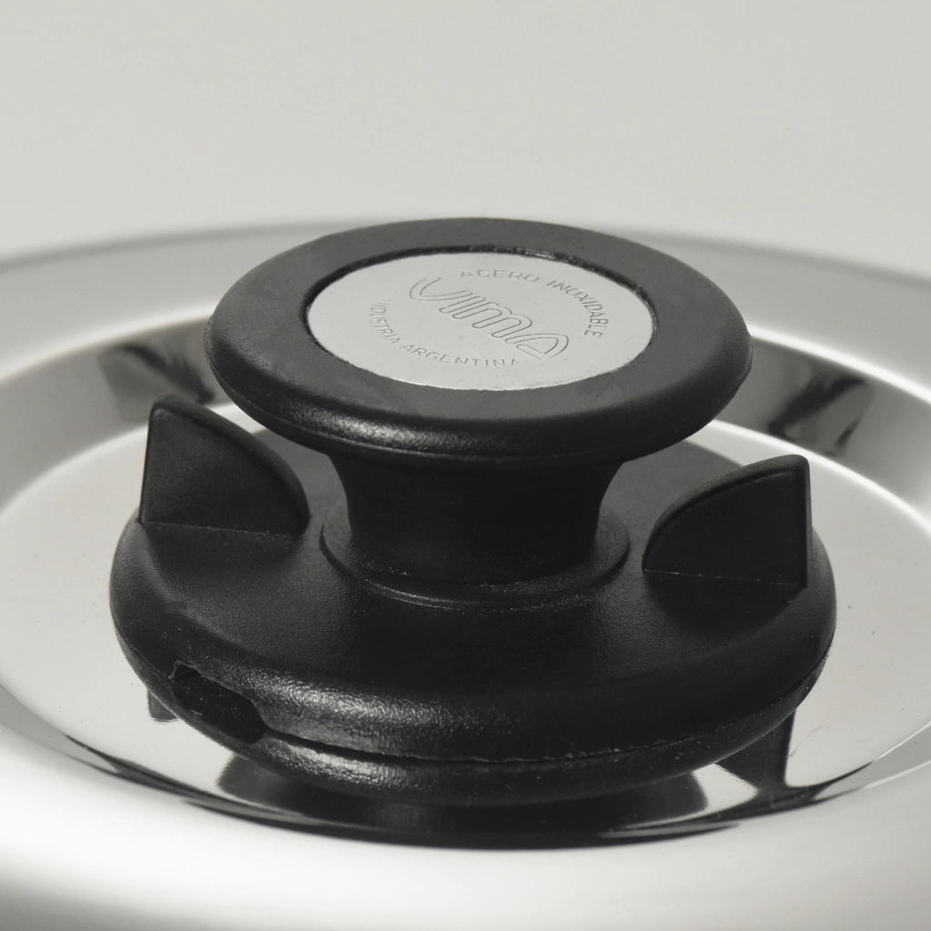 Fabricado en acero inoxidable 18/8 de 0,7 mm de espesor. Posee asas y perilla de baquelita resistentes a altas temperaturas, tapa con escape de vapor y excelente asiento sobre recipiente. Triple fondo acero, aluminio y acero para una mejor difusión del calor