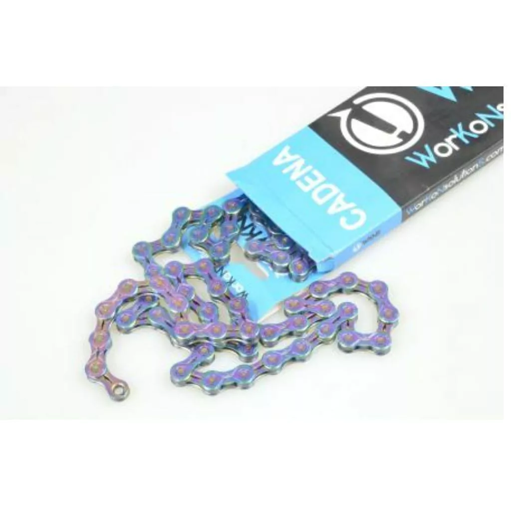 Cadena 12v Wkns Extra liviana Tornasolada 126 eslabonesCADENA - WKNSMaterial de AceroEslabones 126QRs links/LINK reutilizableRecomendad para 12 vel"Extra liviana.-Peso: 260 GRSUso: MTB/RUTA -