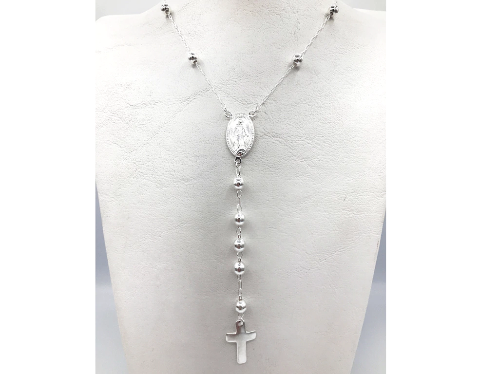 Cadena Denario de Plata 925, de 50cm de largo con bolitas infladas, medalla ovalada de Virgen Misericordiosa con imagen de ambos lados de 1,4cm de diámetro y Cruz bombé lisa de 1,5cm de ancho por 2,2cm de largo.Código 12341.
