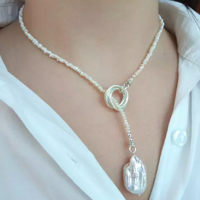 Cadena regulable con mini perlas de rio y dije perla nacarada