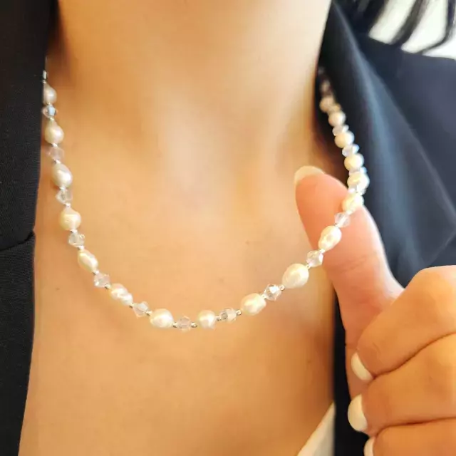 Cadena con perlas de rio y cristal de roca transparente