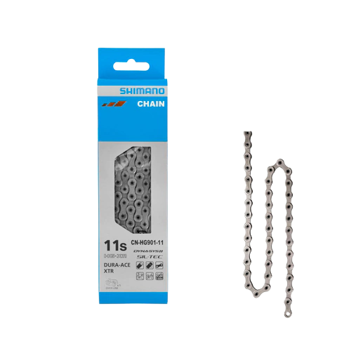 - 11 velocidades - Superestrecha - HYPERGLIDE - SIL-TEC - Cadena de carreteraLas placas y rodillos de la cadena HG901-11 de SHIMANO reciben un tratamiento SIL-TEC completo para mejorar la durabilidad y la eficiencia. Su diseño asimétrico garantiza que los cambios delantero y trasero sean suaves, al mismo tiempo que reduce el ruido de la transmisión. Compatible con las transmisiones de 11 velocidades, la HG901-11 también es adecuada para utilizarlas en bicicletas eléctricas.CARACTERÍSTICASDiseño de placa asimétrica especial HG-X11 para 11 velocidadesTrasmisión trasera Accionamiento suave sin ruidoTrasmisión delantera Se mantiene la seguridad de la cadena en línea de cadena cruzadaCambio delantero y trasero Cambio suave y fiableSIL-TEC en placa/rodilloPasador huecoPeso: 247 g (114 eslabones)