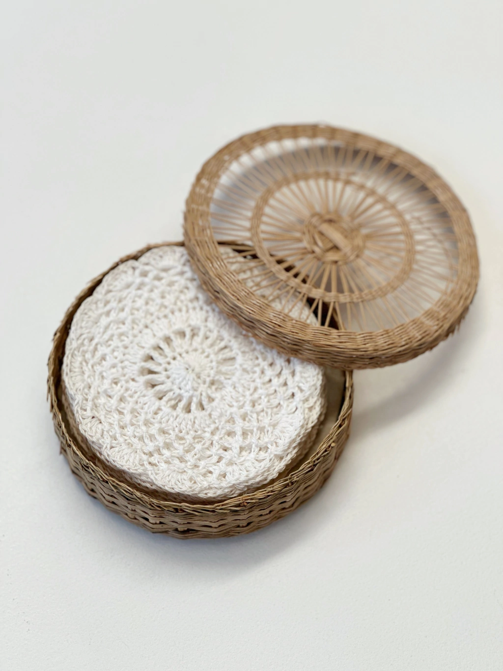 Cajas de fibra natural. Contienen 12 posavasos tejidos al crochet en hilo 100% algodón.