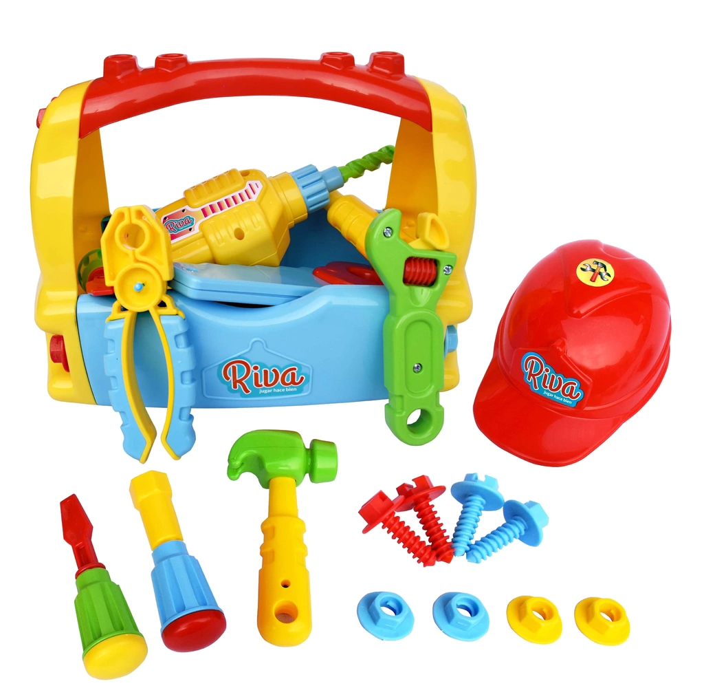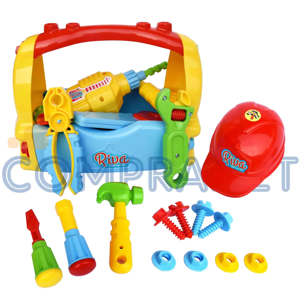 Caja de herramientas con casco para crear, montar y desmontar!El juego incluye alicates, destornillador, llave de tubo, llave inglesa, serrucho, que hace ruido al igual que el real, martillo, tornillos, tuercas y casco.Recomendado a partir de 3 añosPlástico ultra resistente de la más alta calidad.Los colores pueden variar segun disponibilidad.