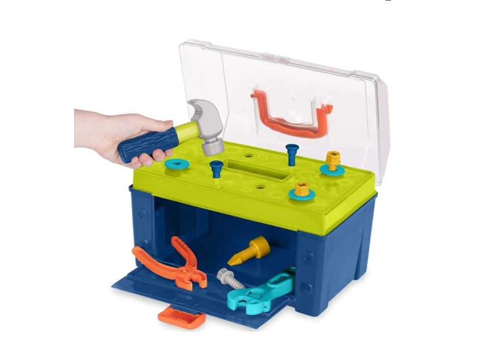 Caja de herramientas de construcción Busy Builder Battat para niños 20 piezasEdad recomendada: +3 años. Desarrolla la motricidad fina y la coordinación ojo-manoDescripción:¡Herramientas de juguete realistas impulsadas por pequeños dedos! La caja de herramientas Busy Builder de Battat está equipada con 20 herramientas de juguete del tamaño perfecto para las manos pequeñas. La caja de herramientas de juguete grande y resistente tiene suficiente espacio de almacenamiento para todas las herramientas de juego. La caja de herramientas también incluye una práctica bandeja de herramientas que se voltea para convertirse en una mesa de trabajo. Y el compartimento frontal se abre para un fácil acceso y más espacio de trabajo. El juego incluye un taladro manual que gira con solo presionar un botón, hace sonidos de perforación realistas y no requiere baterías. También tiene una cinta métrica práctica y completamente funcional para aprender los primeros conceptos matemáticos. Esta caja de herramientas es un juguete perfecto de aprendizaje y simulación para los más pequeños que sueñan con grandes proyectos de construcción en la sala de juegos. El juego de simulación no solo ayuda a mejorar la concentración, sino que también desarrolla las habilidades motoras y la coordinación ojo-mano. Observa a tu pequeño manitas agarrar su caja de herramientas de simulación y seguirlo en el garaje para "hacer lo mismo que tú". Todos los productos Battat cumplen o superan los estándares de seguridad de la UE, EE. UU. Y Canadá.-Contiene: 20 PIEZAS: 1 caja de herramientas de juguete, 1 bandeja de herramientas, 1 taladro de juguete manual, 1 martillo de juguete, 1 llave, 1 par de alicates, 1 cinta métrica, 3 brocas, 4 tuercas, 4 pernos y 2 clavos.-Dimensiones: Alto: 18 cm. x Ancho: 32 cm. x Profundidad: 18 cm.-Material: Plástico-La bandeja se voltea para convertirse en una mesa de trabajo.-Desarrolla la motricidad fina y la coordinación ojo-mano