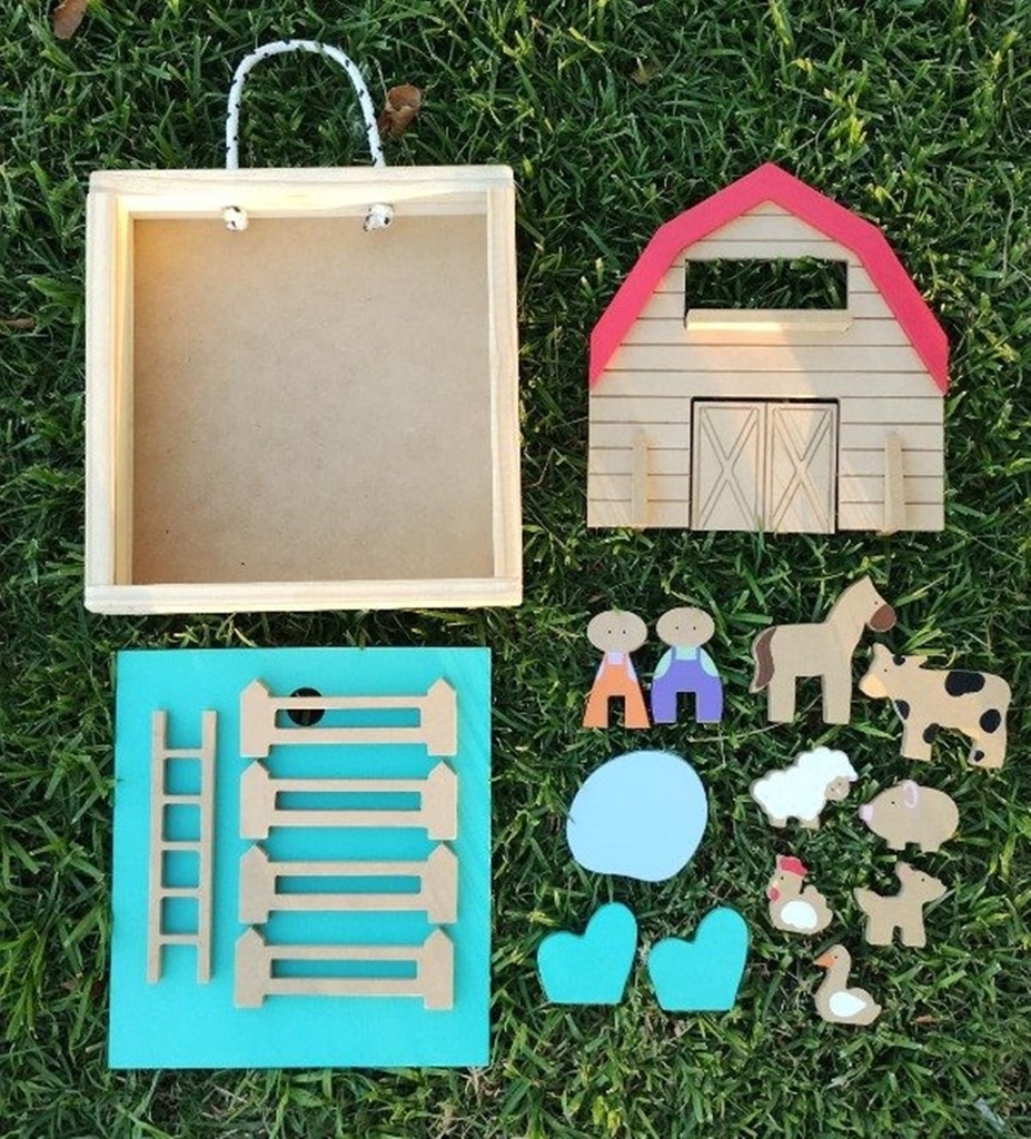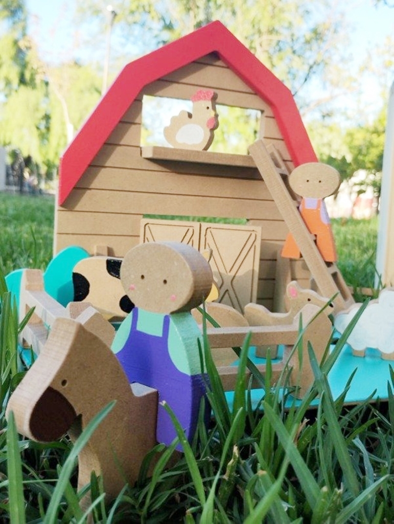 Granero - escenario lúdicoIncluye:1 silueta de granero de 23x24cm4 cercos1 escalera2 personitas de 8cm7 animalitos (caballo 9cm / vaca / oveja / gallina / perro / chancho / pato)1 silueta de lago y 2 siluetas de arbustoEspesor: 12 mm. Todas las siluetas quedan paradasIncluye una cajita tipo valijita para guardar todo de 28x29x30